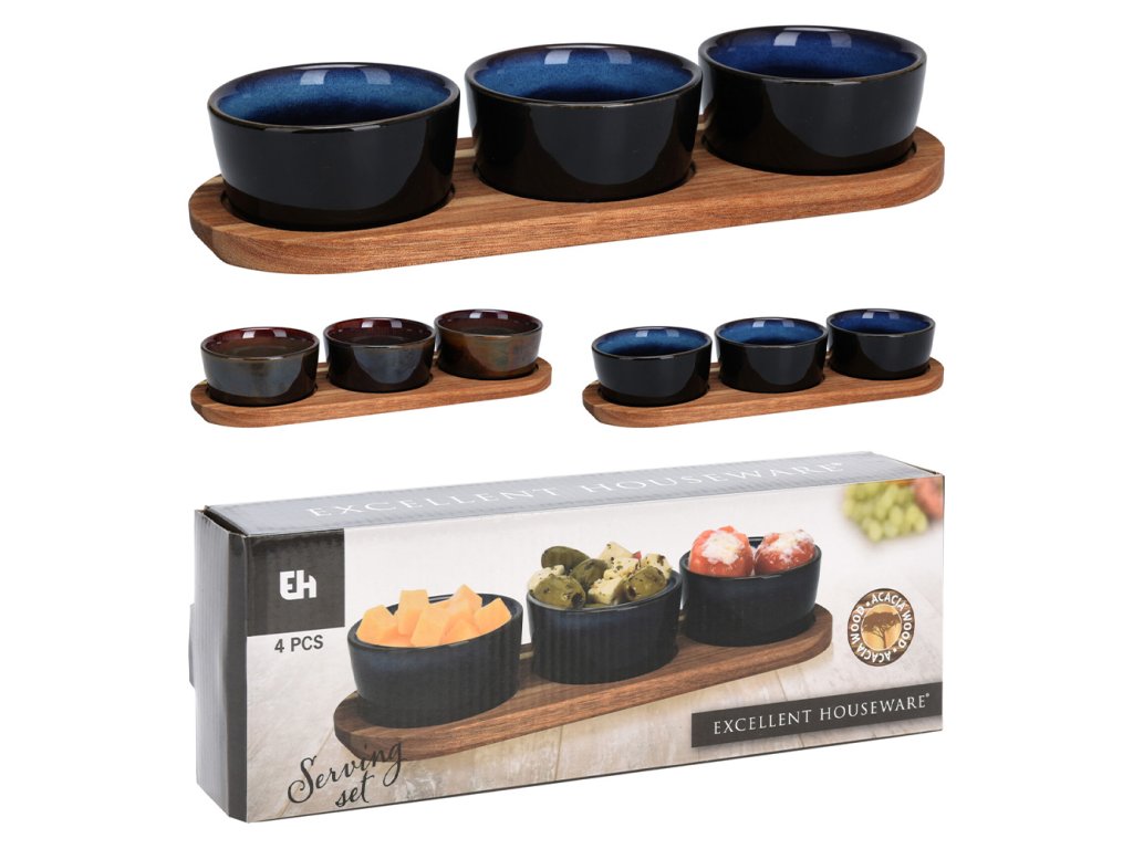 Sada na stolování, 3 misky o průměru 85 mm, výška 40 mm na dřevěném podnosu.