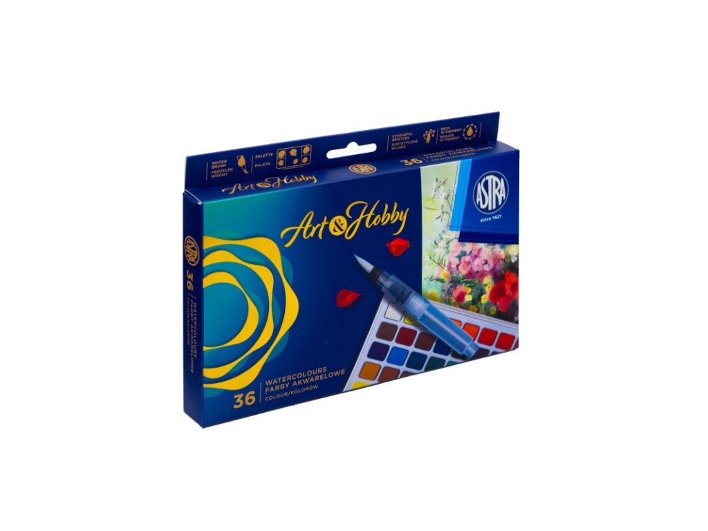Sada akvarelových barev ASTRA Art & Hobby obsahuje 36 intenzivních odstínů, vodní štětec a vestavěnou paletku pro míchání barev.