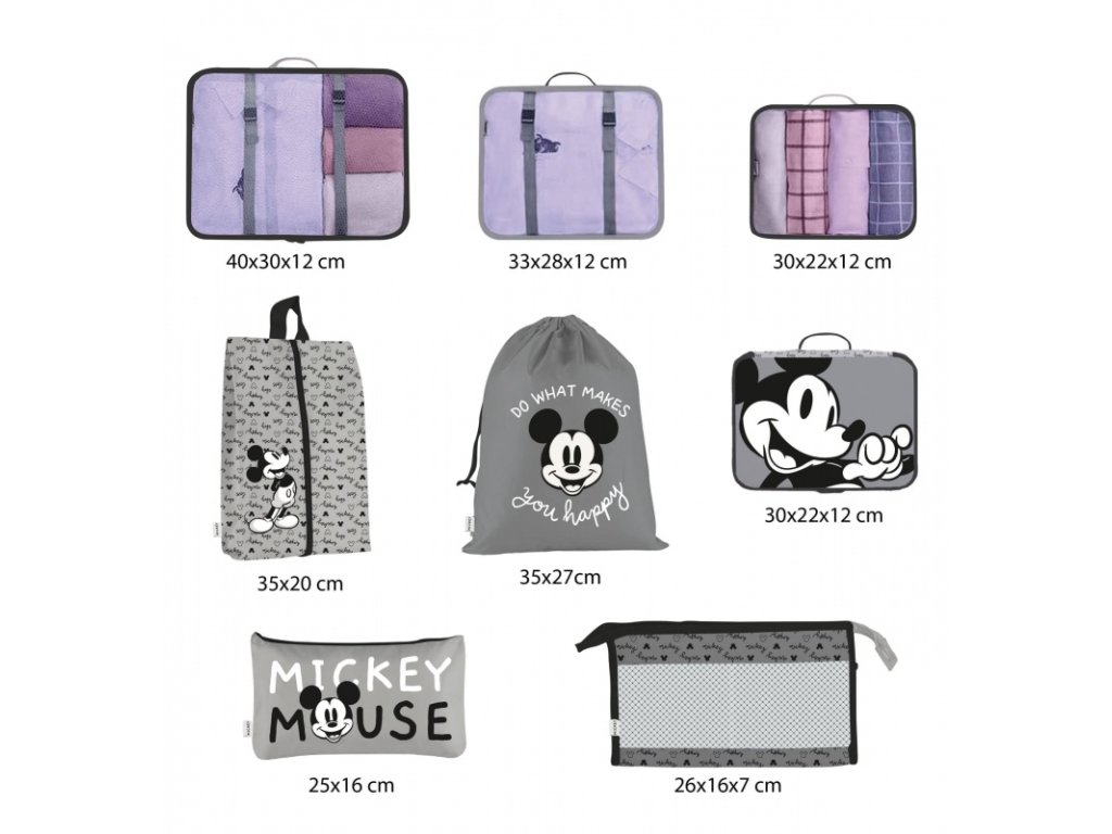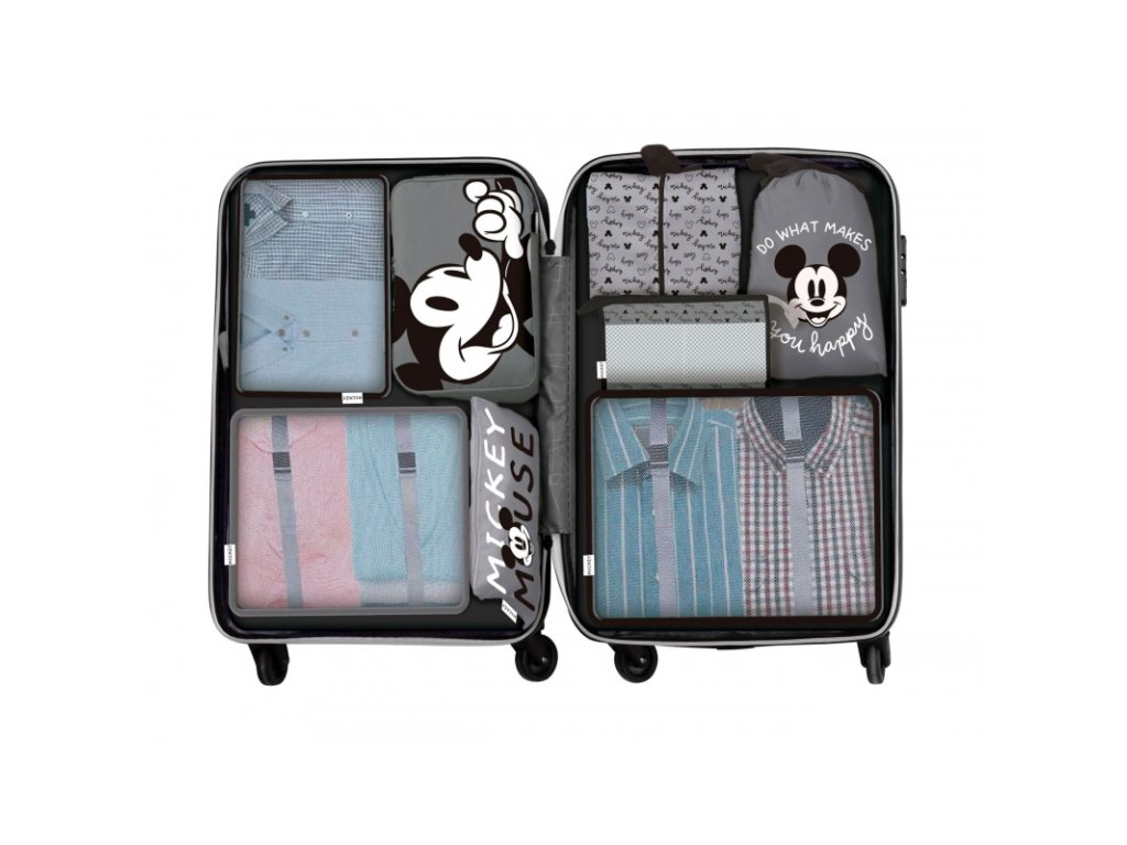 Sada cestovních organizérů Mickey Mouse je praktickým řešením pro přehledné balení kufru. Obsahuje osm tašek různých velikostí, které umožňují efektivní rozdělení oblečení, obuvi, spodního prádla, kosmetiky i drobných předmětů.