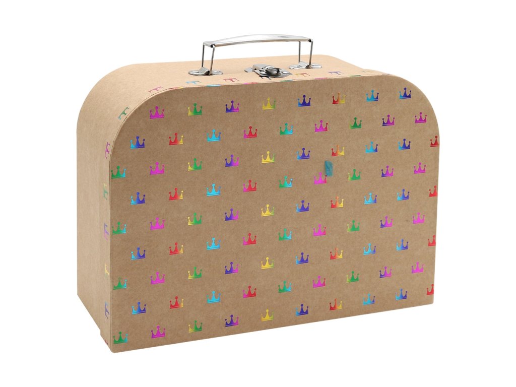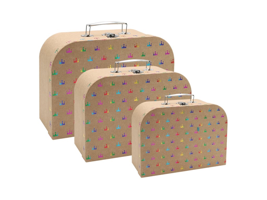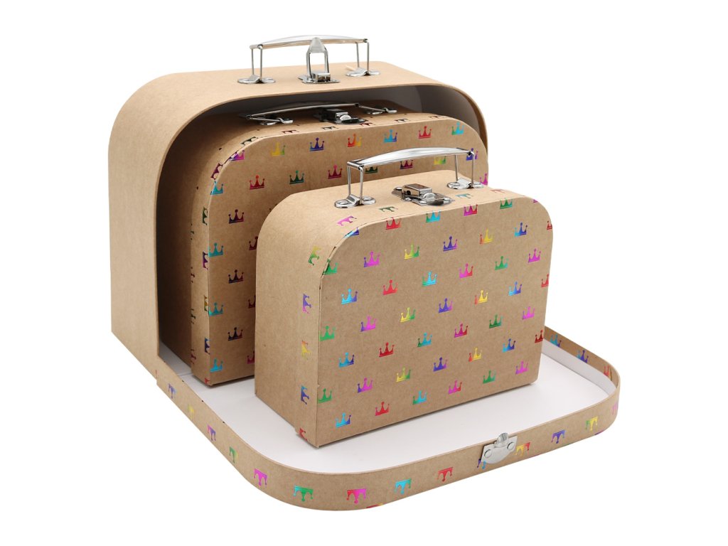 Sada tří dětských kufříků z pevného kartonu a kovovým kováním (motiv korunky).