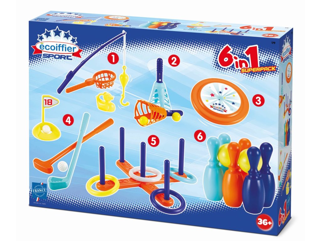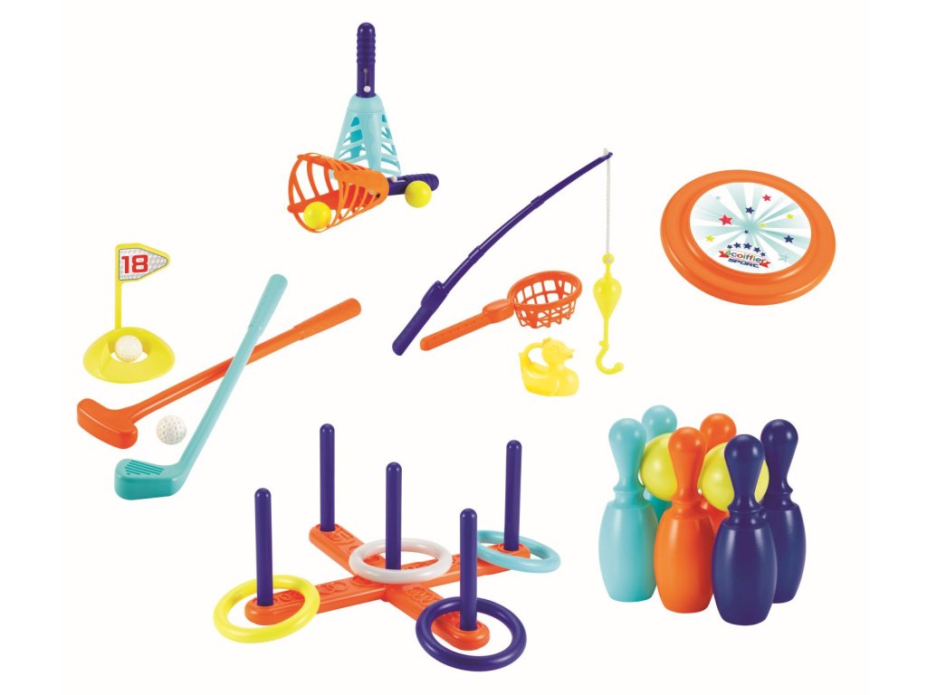 Sada 6 her vhodných do interiéru i exteriéru - frisbee, chytání rybiček, golf, chyť míček, kroužky na kříž a kuželky. Vše plastové, vyrobeno ve Francii.Doplňkové parametry