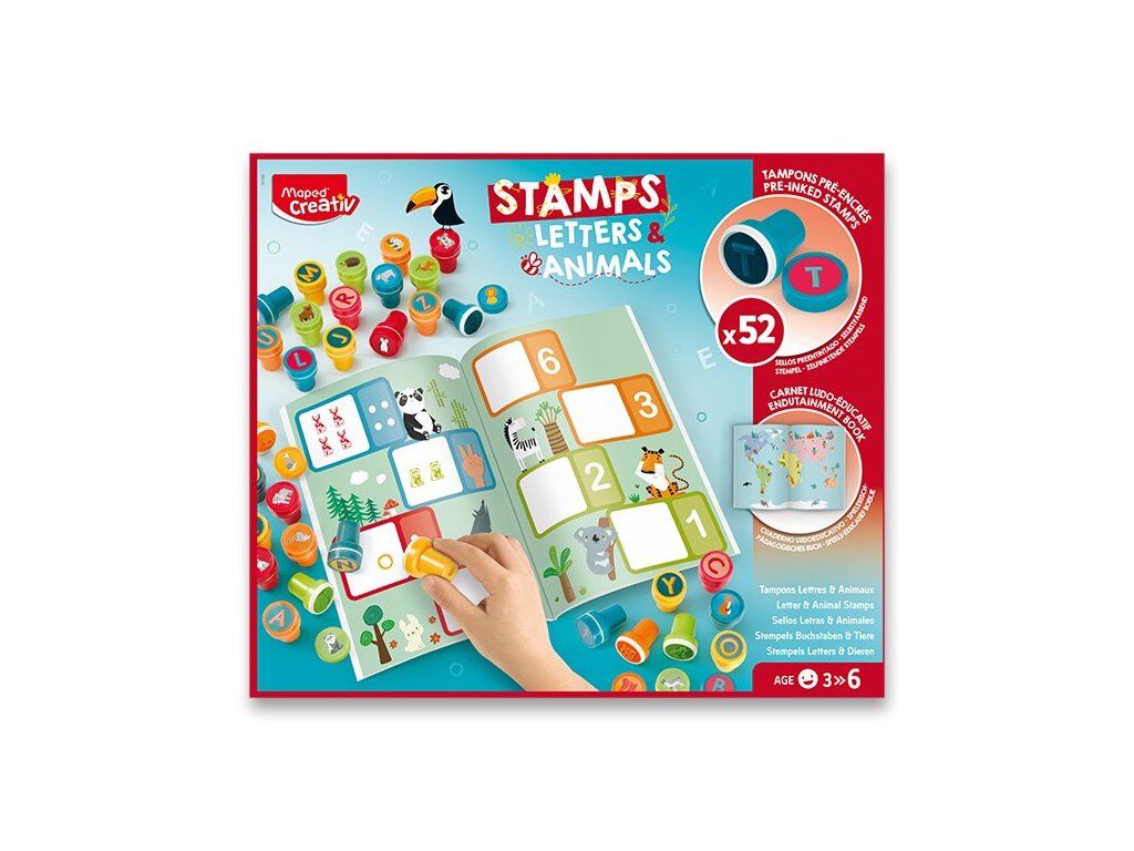 Kreativní sada Maped Creativ Stamps Alphabet & Animals umožňuje zábavnou aktivitu, při které poznáte abecedu a zvířátka z celého světa. Sada obsahuje blok (20 stran) s ilustracemi ze světa zvířat a 52 ks razítek s předtištěnými motivy (26 ks s abecedou a 26 ks se zvířátky). Omyvatelný inkoust. Jednoduché a čisté použití. Vhodné pro děti od 3 let. Inkoust je vypratelný z většiny textílií.Doplňkové parametry