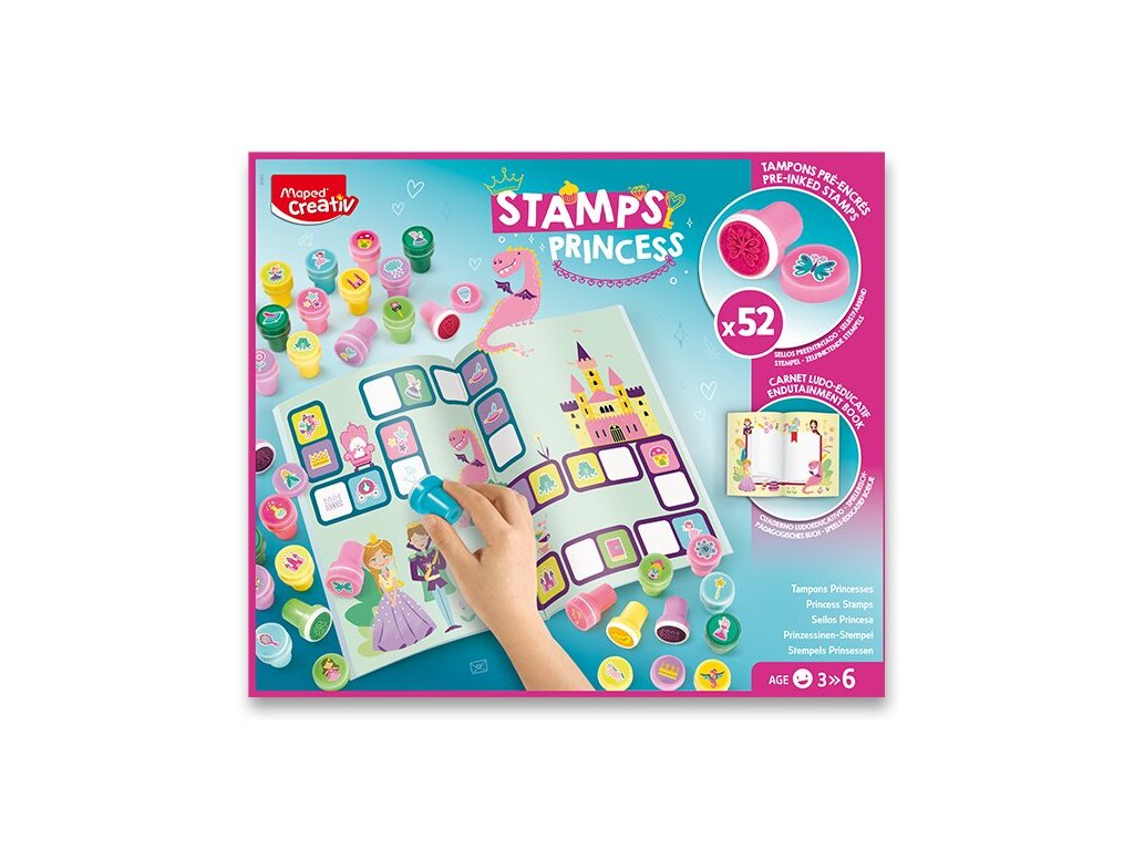 Kreativní sada Maped Creativ Stamps Princess umožňuje zábavnou aktivitu, při které objevíte svět princezen, jejich zámků a mnoho dalšího. Sada obsahuje blok (20 stran) s pohádkovými ilustracemi a 52 ks razítek s předtištěnými motivy a v různých barvách. Omyvatelný inkoust. Jednoduché a čisté použití. Vhodné pro děti od 3 let. Inkoust je vypratelný z většiny textílií.Doplňkové parametry