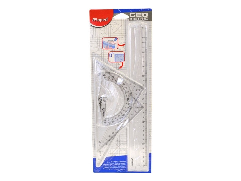 Rýsovací sada Maped Geometric určená pro praváky Obsahuje geometrické pravítko (30 cm), dva trojúhelníky (60 stupňů/ 21 cm, 45 stupňů/ 21 cm, "0" umístěná v pravém úhlu - pro měření a rýsování), úhloměr (180 stupňů/ 12 cm základna), čisté rýsování. Vysoce kvalitní a optimálně odolné značení natištěné UV inkoustem. Ergonomický úchop a čirá barvaDoplňkové parametry