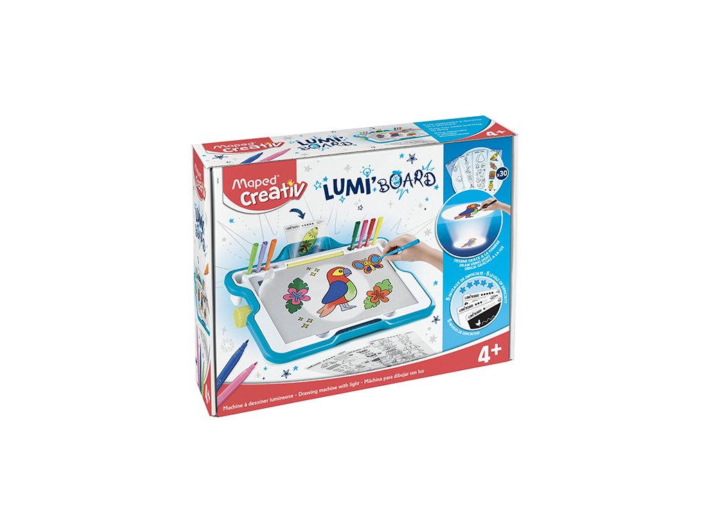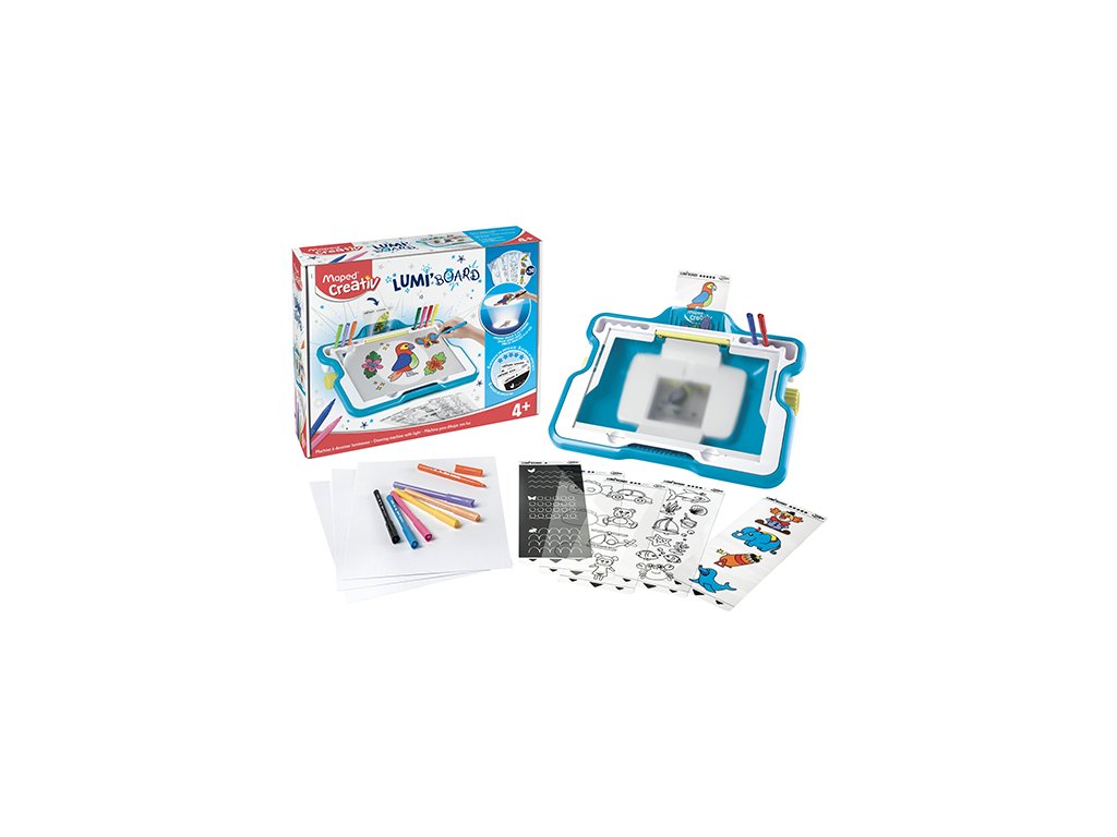 SADA LUMI BOARD. Kreativní kufřík, který funguje jako předloha na kreslení. Do kufříku vložíte obrázek, který se podsvítí a obrázek tak můžete překreslit na papír. Souprava obsahuje 250 předloh s obrázky, 12 barevných fixů.Doplňkové parametry