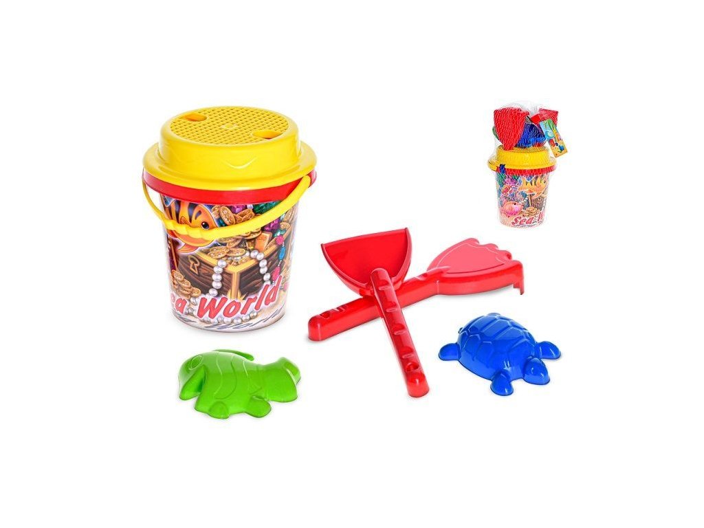 Plastová sada na písek s motivem vodní svět obsahuje kyblík, sítko, lopatku, hrabičky a dvě různé formičky.Doplňkové parametry