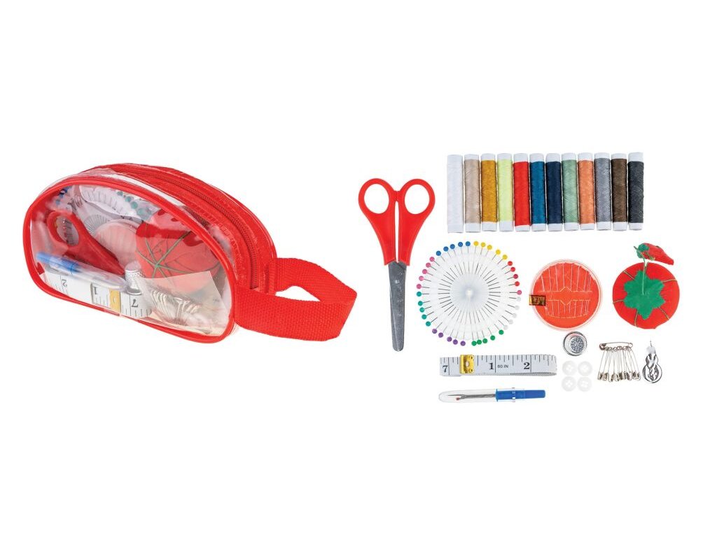 Sada na šití obsahuje: jehly, náprstek, nůžky, houbičku na jehly, spícnací špendlíky, knoflíky, metr krejčovský.Doplňkové parametry