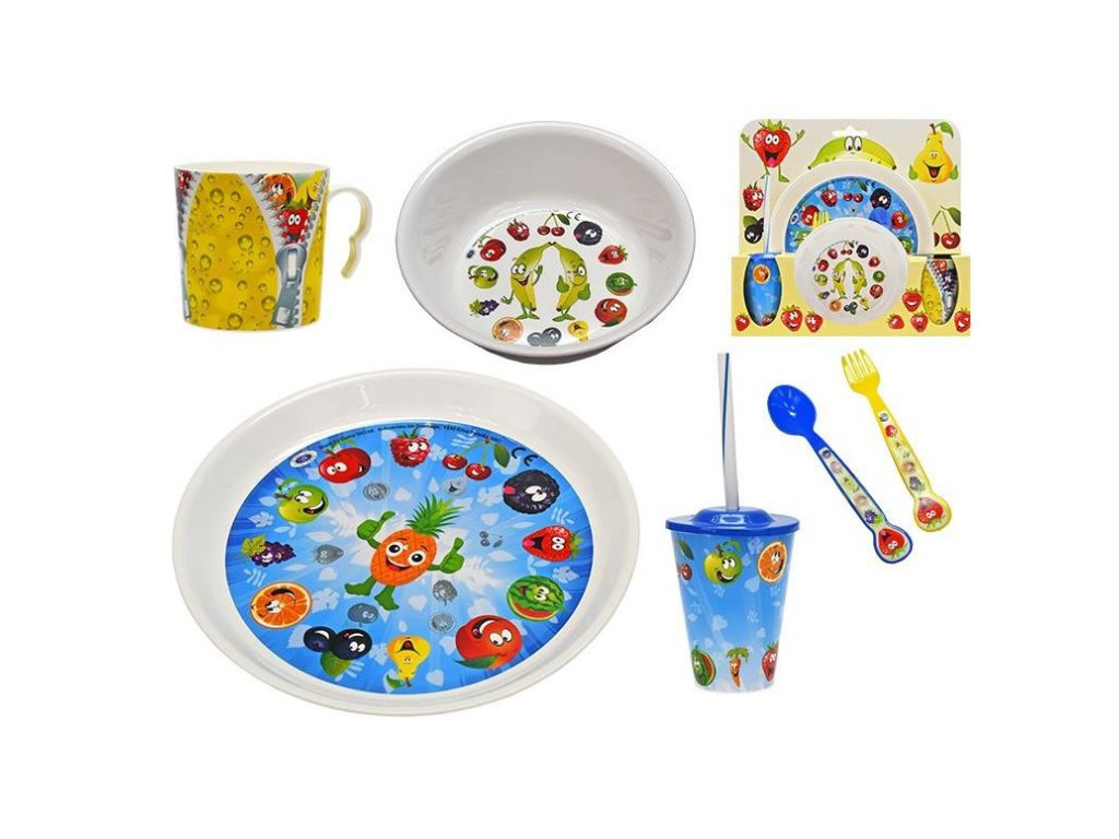 Sada nádobí plastová ovoce Sada je balená v krásné papírové krabičce Sada obsahuje misku, talířek, lžíčku,vidličku, kelímek s brčkem,hrníček Vhodné pro děti od 10 mDoplňkové parametry