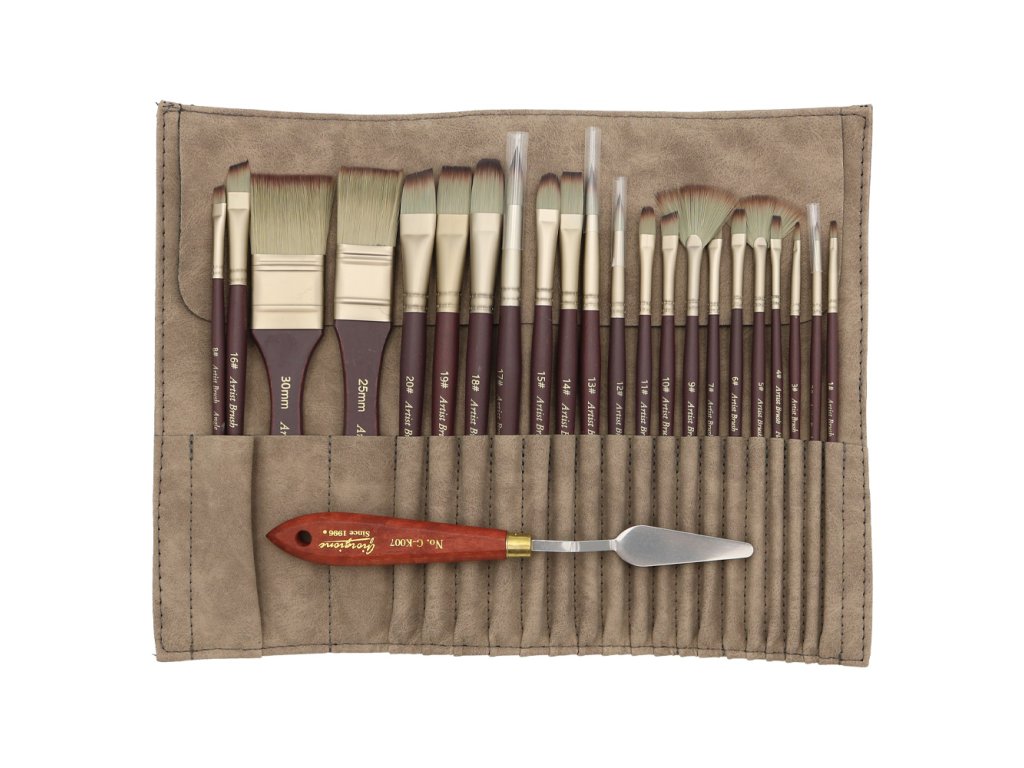 Sada 22 ks štětců pro výtvarníky /umělce v praktickém svinovacím balení + špachtle.
