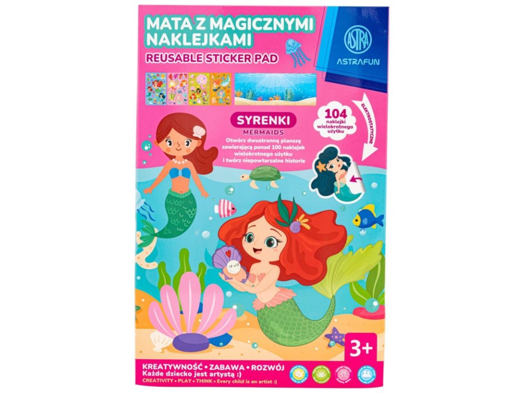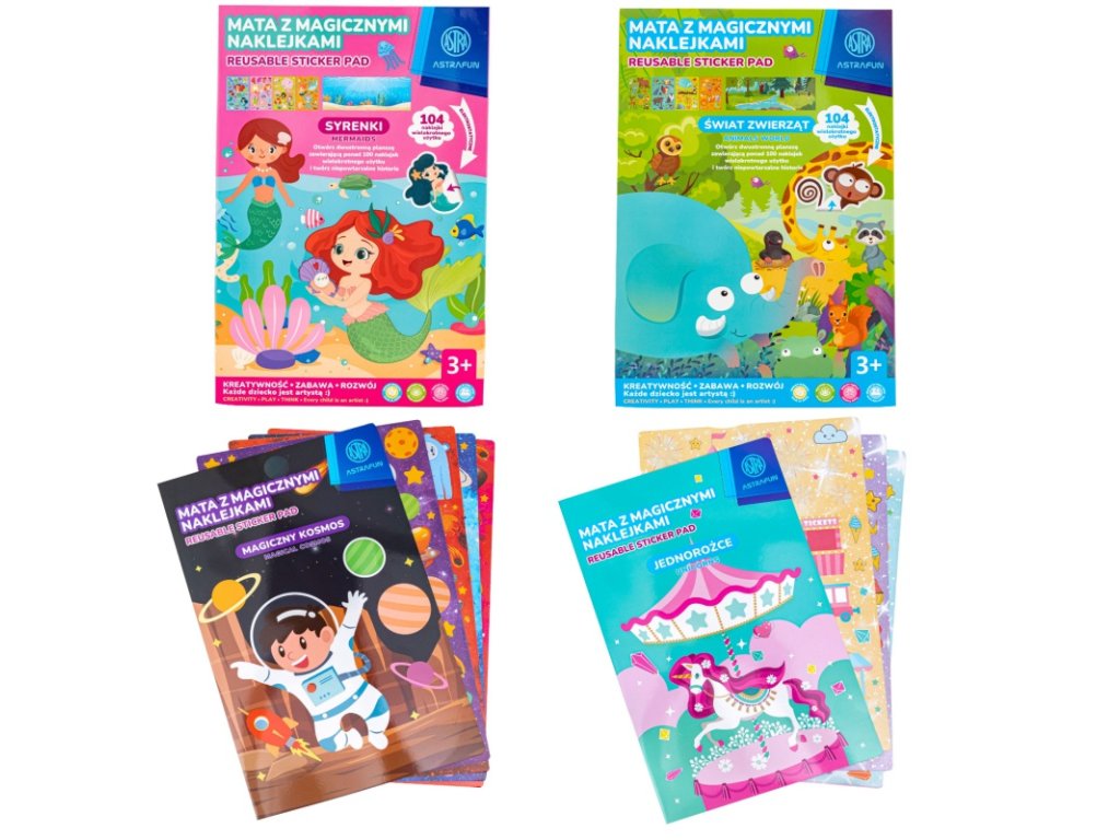 Objevte kouzlo tvoření s XL sadou magických nálepek AstraFun! Obrovská oboustranná podložka (86×30 cm) a 104 znovupoužitelných nálepek otevřou dětem nekonečný svět fantazie. Na výběr jsou motivy jednorožce, zvířat, vesmíru a mořských panen – zasíláme dle skladové dostupnosti.
