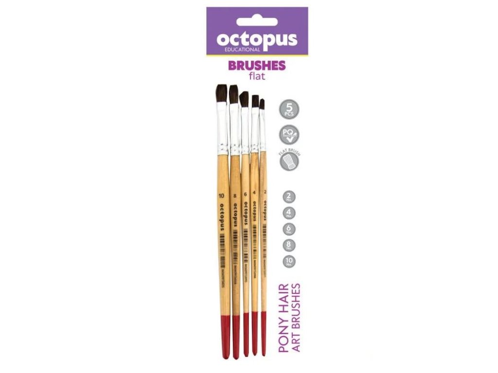 Ploché štětce Octopus jsou vyrobeny z kvalitních pony štětin. K olem krátké dřevěné rukojeti je hliníkový kroužek. Štětec je vhodný pro všechny malířské styly. Balení obsahuje pět štětců různých tlouštěk: 2, 4, 6, 8 a 10.Doplňkové parametry