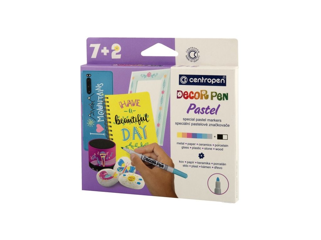 Decorpen - značkovače Centropen, 2738 pastel, sada 7+2 ks. Sada 7 pastelových, 1 černý a 1 bílý značkovač určený k dekorování předmětů a popisování různých materiálů (kov, papír, keramika, porcelán, sklo, plast, fólie, kraslice, kámen). Světlostálý pigmentový inkoust na vodní bázi Po dokonalém zaschnutí (min.4 hod.) je stopa zcela fixována do povrchu materiálu a stává se odolnou vůči otěru na porézních površích a vodě. Z neporézních materiálů lze smýt vodou se saponáty.Doplňkové parametry