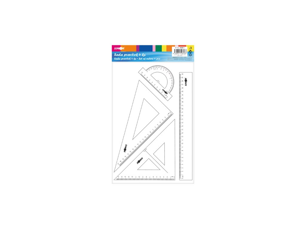 4-kusová rýsovací sada pravítek, vyrobená z transparentního plastu. Součástí soupravy je trojúhelník s ryskou 17cm, pravoúhlý trojúhelník 24cm, pravítko 30cm / 12inch, a úhloměr 10cm. Baleno v plastovém pouzdru. Kvalitní, cenově dostupná sada, kterou firmDoplňkové parametry