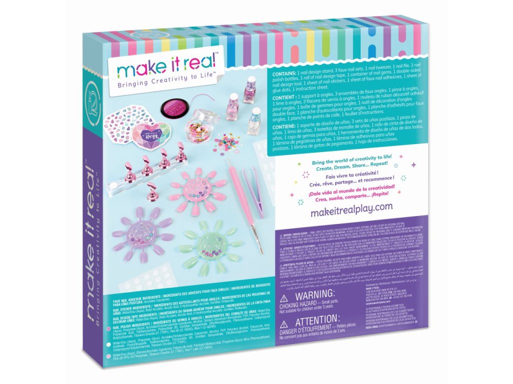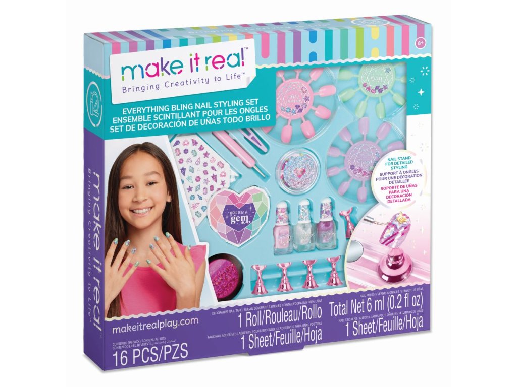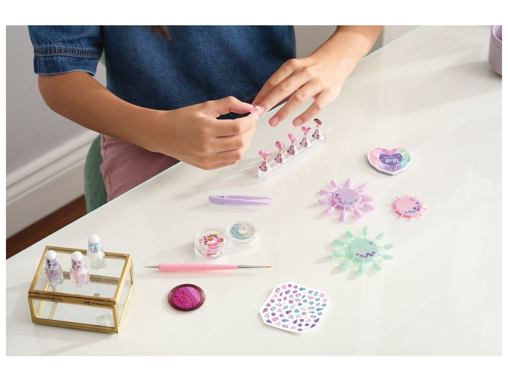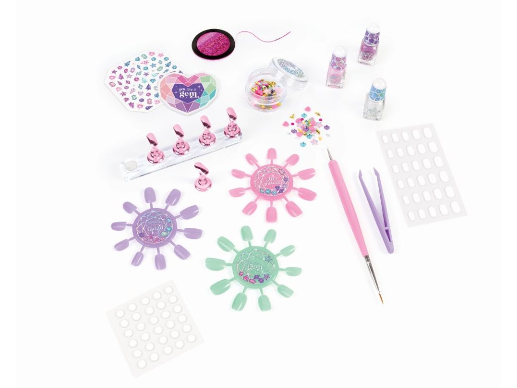Přineste bling! Vytvářejte úžasné vzory zdobené drahokamy pomocí umělých nebo přírodních nehtů. Pomocí stojanu na design nehtů umístěte číslice pro design nebo připevněte přiložené umělé nehty a ozdobte je lakem, fóliovou designovou páskou, drahokamy a nálepkami na nehty. Pomocí praktického oboustranného nástroje pro navrhování mohou děti vytvářet zábavné tečkované a vlastní návrhy. Mladé módní modelky mohou pozvednout svůj styl s touto kompletní sadou na nehty. Ideální pro děti, které hledají úvod do nehtového stylingu a designu, a ideální pro povzbuzení sebevyjádření a kreativity. Je to skvělý tip na dárek, ať už k svátku, narozeninám nebo jen tak! Veškerá kosmetika je testována na bezpečnost pro děti ve věku 8+.Doplňkové parametry