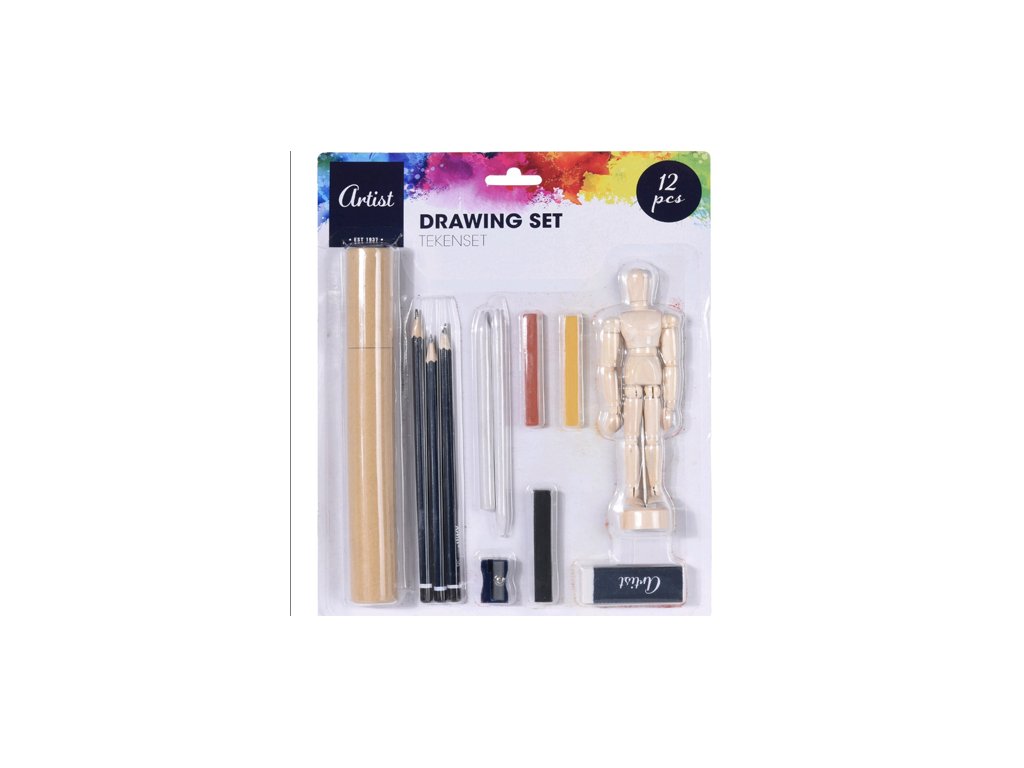 Set na kreslení pro umělce na výtvarnou výchovu. Sada 12 ks. Sada obsahuje: tužku tvrdost HB, 5B a 6B, ořezávátko, gumu, 2xpapierové roztieratko, 3xpastel, papírový tubus a dřevěnou figurku (velikost 155 mm).Doplňkové parametry