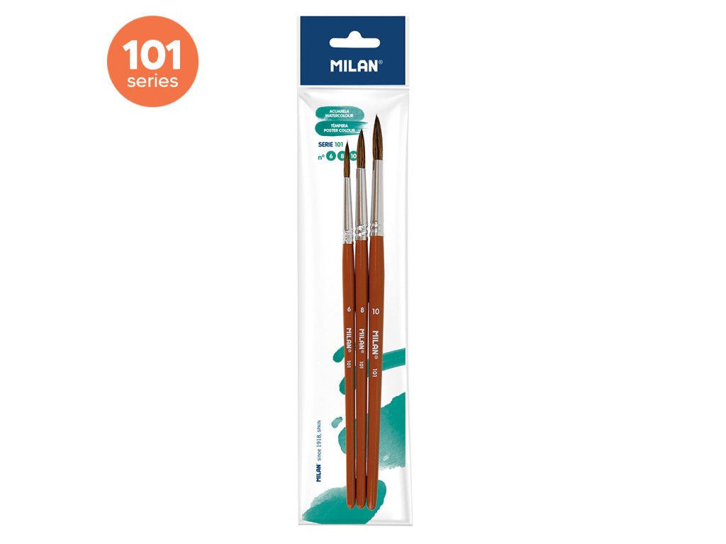Sada 3 ks štětců MILAN řady 101, vyrobené z pony vláken. Vhodné pro akvarelové barvy a plakátové techniky. 3 velikosti: 6, 8 a 10.Doplňkové parametry