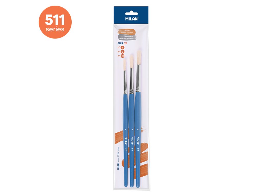 Sada 3 ks štětců MILAN z přírodních štětin, kulaté. Poniklované kování a ergonomické držadlo v horní části štětce. Doporučeno pro použití ve školách, pro natírání lepidla, laku, barvu plakátových a hustých barev. 3 velikosti: 6, 8 a 10.Doplňkové parametry