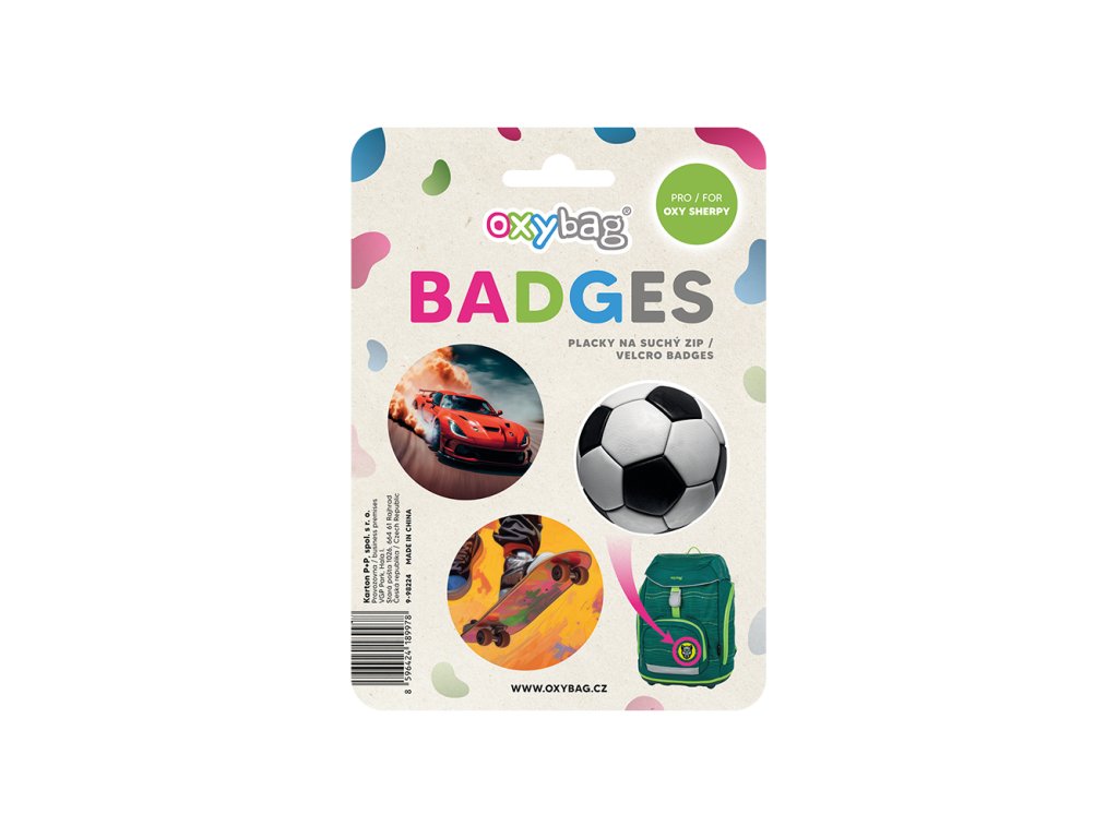 Tři vyměnitelné placky na suchý zip k ozdobení batohu OXY Sherpy.Doplňkové parametry