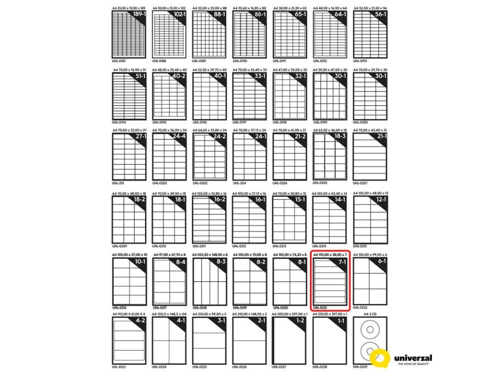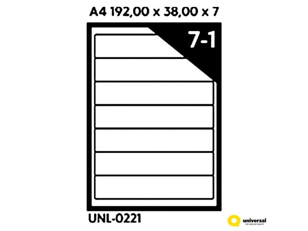 Samolepicí etikety na listu A4 Vhodné pro tisk čárových kódů, adresních štítků, kancelářskou evidenci, atd. Rozměry etiket 192 x 38 mm 1 list formátu A4 obsahuje 7 etiket Vynikající přilnavost i na chladné a vlhké povrchy Balení obsahuje 100 listůDoplňkové parametry