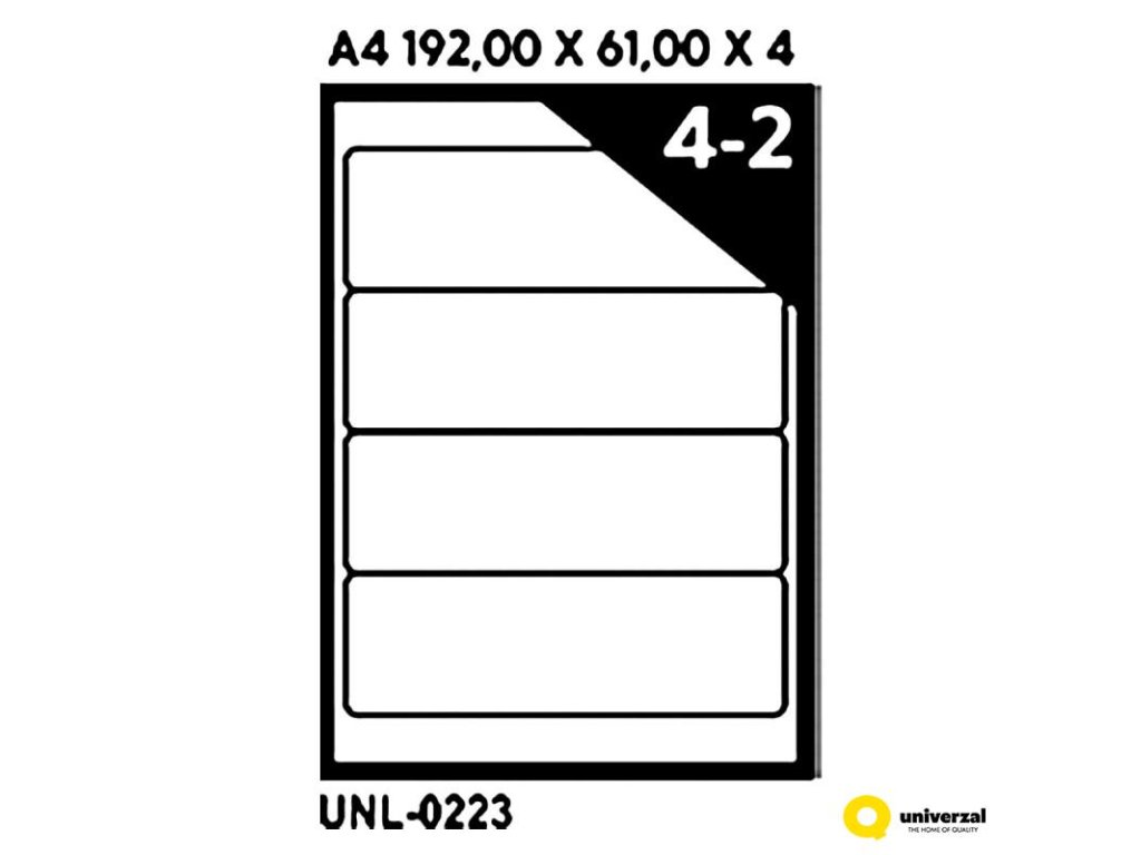 Samolepicí etikety na listu A4 Vhodné pro tisk čárových kódů, adresních štítků, kancelářskou evidenci, atd. Rozměry etiket 192 x 61 mm 1 list formátu A4 obsahuje 4 etiket Vynikající přilnavost i na chladné a vlhké povrchy Balení obsahuje 100 listůDoplňkové parametry