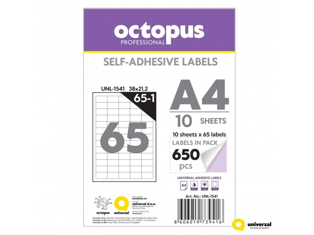 Podrobný popis: Samolepicí etikety na listu A4 Vhodné pro tisk čárových kódů, adresních štítků, kancelářskou evidenci, atd. Rozměry etiket 38 x 21,2 mm Balení obsahuje 10 listů, tj. celkem 650 etiket. Vynikající přilnavost i na chladné a vlhké povrchy Obchodní informace: Dovozce: Reas-Pack s.r.o.Doplňkové parametry