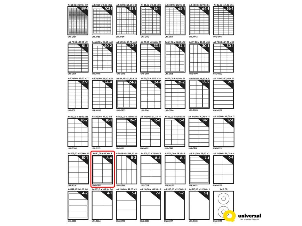Samolepicí etikety na listu A4 Vhodné pro tisk čárových kódů, adresních štítků, kancelářskou evidenci, atd. Rozměry etiket 97 x 67.7 mm 1 list formátu A4 obsahuje 8 etiket Vynikající přilnavost i na chladné a vlhké povrchy Balení obsahuje 100 listůDoplňkové parametry