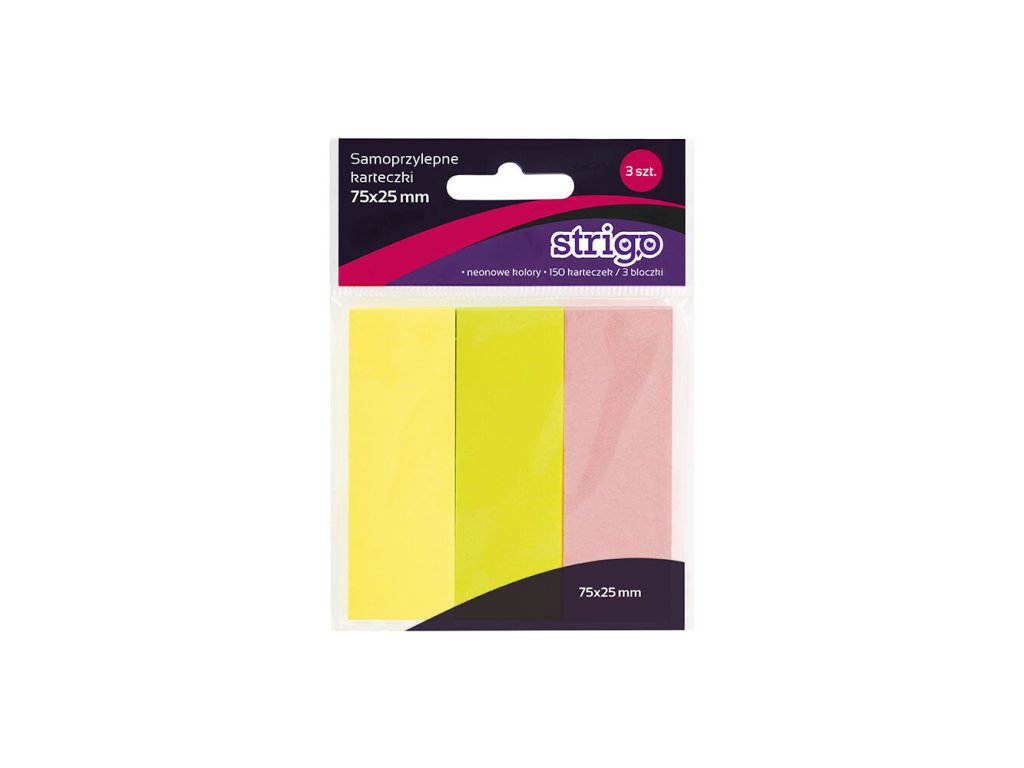 Samolepící záložky Strigo jsou ideální pro zvýraznění, označení a indexování důležitých informací. Jasné neonové barvy zajišťují dobrou čitelnost poznámek. Rozměr: 75 x 25mm, počet kartiček: 150 ks (3 bloky), barvy: neonové.Doplňkové parametry