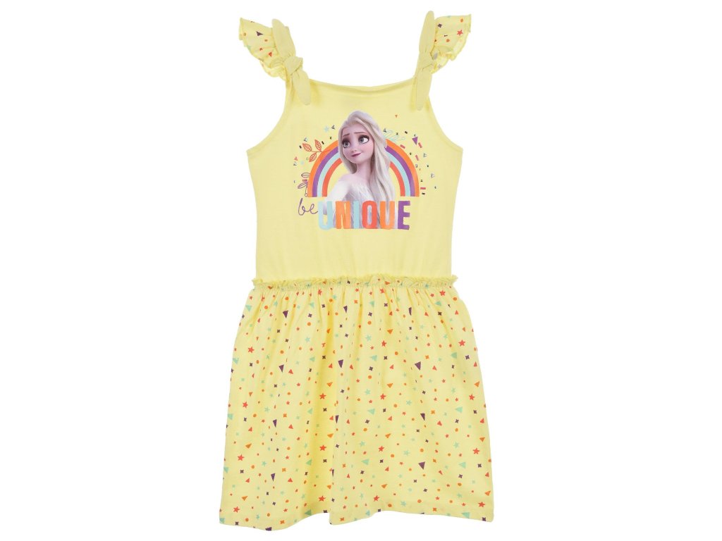 Dívčí šaty s motivem Disney Frozen.Materiál: 100% bavlna. Barva: žlutá.Výrobce: Sun City. Oficiální licence. Sun City 8/10 Avenue du Stade de France 93216 Saint-Denis E-mail: service-client@sun-city.frDoplňkové parametry