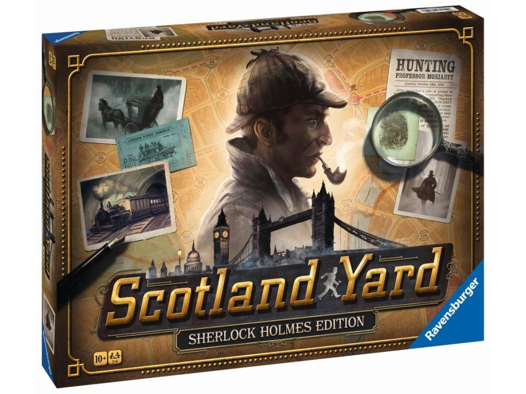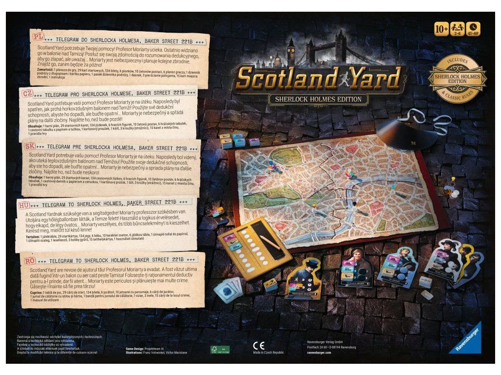 Scotland Yard potřebuje vaši pomoc! Profesor Moriarty je na útěku. Naposledy byl spatřen, jak prchá horkovzdušným balonem nad Temží! Použijte své dedukční schopnosti, abyste ho dopadli, ale buďte opatrní... Moriarty je nebezpečný a spřádá plány na další zločiny. Najděte ho, než bude pozdě! V této verzi hry Scotland Yard pátrá Sherlock Holmes a jeho společníci po zločineckém géniovi, profesoru Moriartym. Můžete si vybrat, jestli budete hrát detektivy, nebo Moriartyho. Hru můžete hrát podle původních pravidel nebo podle speciálních pravidel Sherlocka Holmese. „Ach, to jste vy... pojďte dál! Pan Holmes a ostatní vás již očekávají. Společnými silami jistě uspějete a konečně dopadnete profesora Moriartyho!“ Dveře bytu na Baker Street 221B se zavírají – hon na Moriartyho začíná! Obsahuje: 1 herní plán, 29 startovních karet, 134 jízdenek, 6 hracích figurek, 10 žetonů postav, 6 hráčských tabulek, 1 cestovní tabulku s papírem a tužkou, 1 kartonový proužek, 1 kšilt, 3 kroužky (strážníci), 15 karet z místa činu, 1 pravidla hryDoplňkové parametry