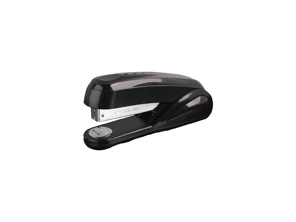 Plastová sešívačka v černém provedení, výkon sešití až do 20 listů, vhodná náplň spinek 24/6 a 26/6. Typ sešitu flat clinch – šetří až 25% místa jako běžný typ sešití. Délka ramene: 57 mmDoplňkové parametry