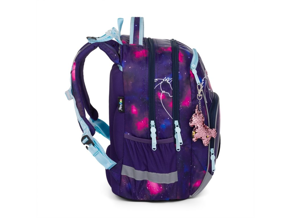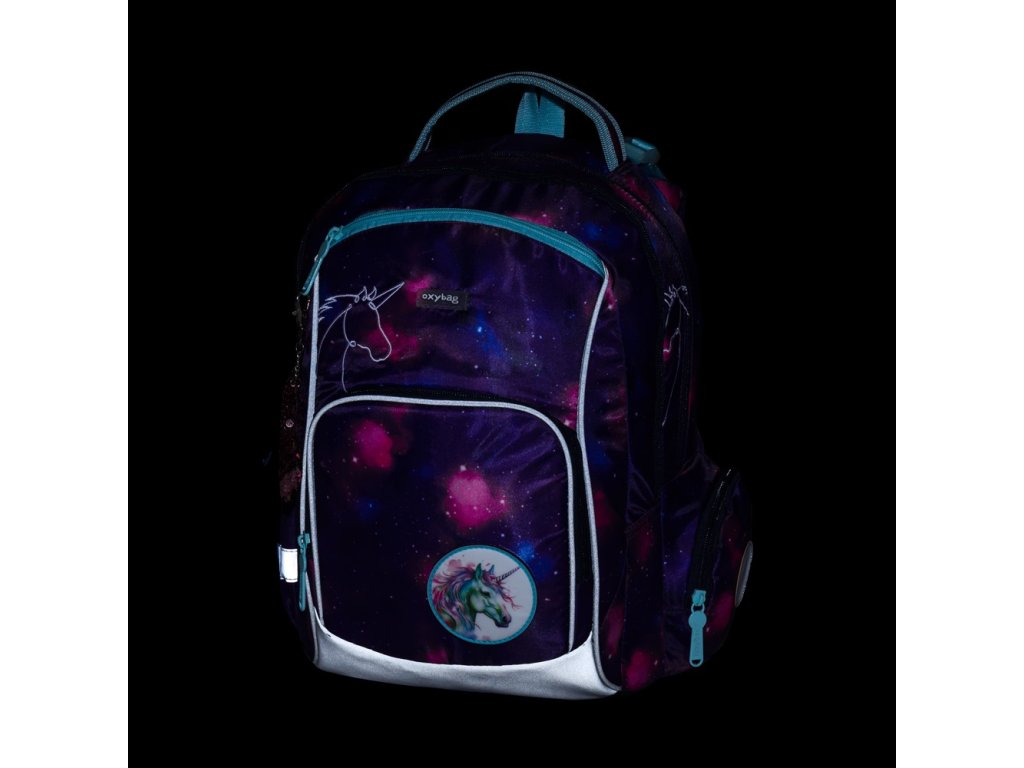 Školní batoh OXY GO zaujme moderním designem a promyšlenou funkčností. Má anatomicky tvarovaná, prodyšná záda a nastavitelné ramenní popruhy pro pohodlné nošení. Přidané háčky umožňují uchycení dlouhých popruhů. Vnitřní kapsy nabízí dostatek místa na učebnice, sešity i další potřeby, pevné nepromokavé dno chrání obsah před ušpiněním a protečením. Boční kapsy, jedna na zip a jedna otevřená, slouží např. na láhev. Reflexní prvky zajišťují bezpečnost. Batoh je ideální pro děti od 1. do 3. třídy vysoké od 125 cm. Délka zádového panelu je 39 cm, objem 22 l, hmotnost 930 g, nosnost 8 kg. Sáček: Praktický na cvičky nebo volnočasové aktivity, uzavírá se šňůrkami. Penál: Jednopatrový se dvěma chlopněmi, poutka na psací potřeby a průhledná fólie na rozvrh hodin.Doplňkové parametry