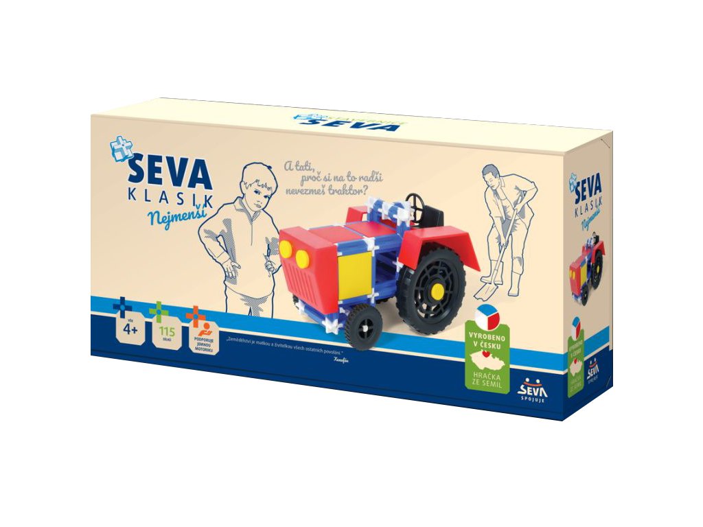 Chybí Vám v SEVĚ traktor? Rozšiřte si stavebnici SEVA o toto vozidlo. SEVA Traktor obsahuje dvě velká traktorová kola, blatníky a masku. Celkem je v balení 115 dílků. Stavebnice je určena dětem od 4 let. Vyhovuje evropské normě EN71 o bezpečnosti hraček a její kvalita je pravidelně kontrolována. Všechny stavebnice SEVA jsou navzájem kompatibilní a jejich možnosti se dají stále rozšiřovat.Doplňkové parametry