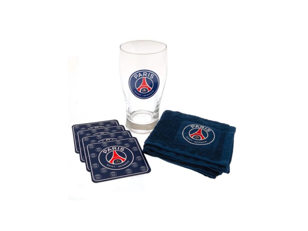 Oficiální, dárkový produkt se znakem a v klubových barvách slavného klubu PARIS SAINT-GERMAIN FC Atraktivní barový set se sklenkou, malým ručníkem a čtyřmi pivními podložkami.• sklenice - výška 16cm, objem 500ml