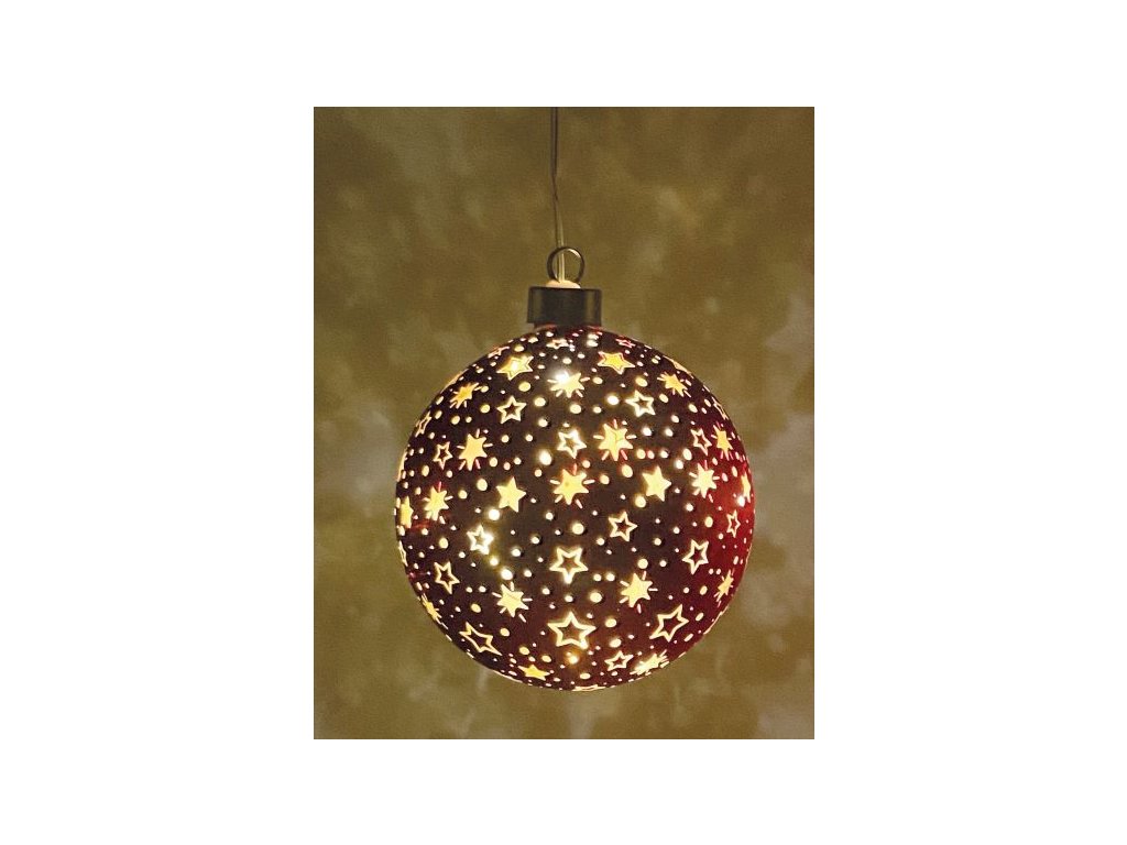 Ručně foukaná skleněná svítící koule s LED osvětlením a časovačem - červený povrch s čirými hvězdičkami - průměr 12 cm - na tužkové baterie - baterie jsou součástí balení - na zavěšení - s časovačem. Po zapnutí svítí 6 hod. poté se sama vypne a další den ve stejnou dobu zapne opět na 6 hod.Doplňkové parametry