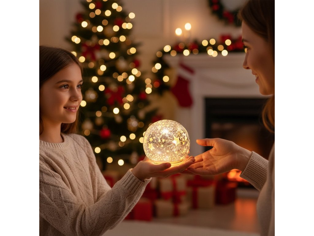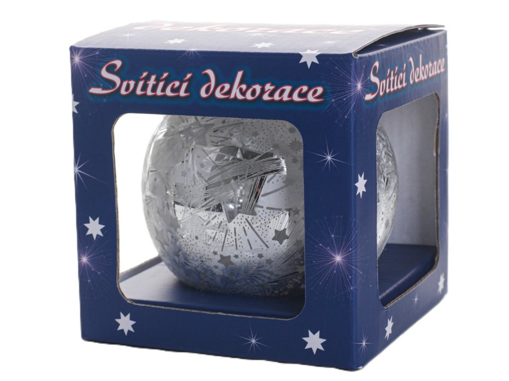 Ručně foukaná skleněná svítící koule s LED osvětlením S časovačem. Po zapnutí svítí 6 hod. poté se sama vypne a další den ve stejnou dobu zapne opět na 6 hod. Stříbrný povrch s hvězdičkami Průměr 10 cm Na 3 tužkové baterie AAA, baterie nejsou součástí balení. Krásná vánoční dekorace na každý stůlDoplňkové parametry