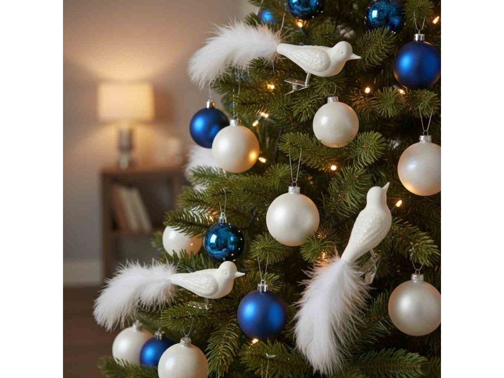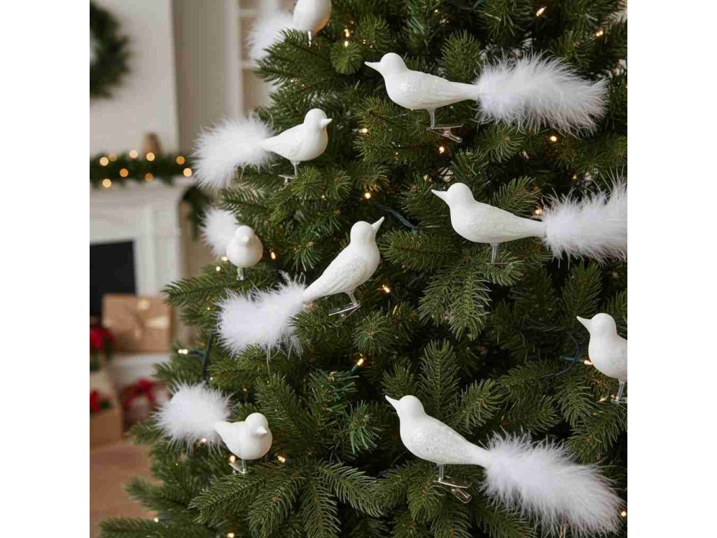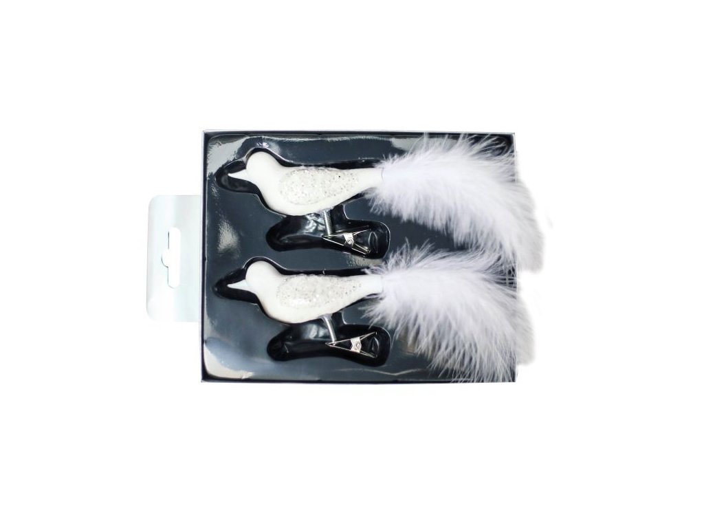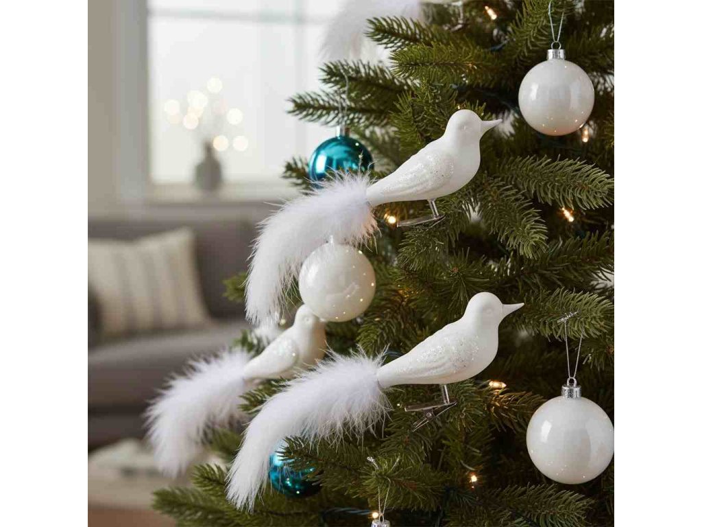 Ručně foukaný skleněný ptáček ocasem z peříček Sada 2 ks Barva bílá Krásná ozdoba pro každý vánoční stromekDoplňkové parametry