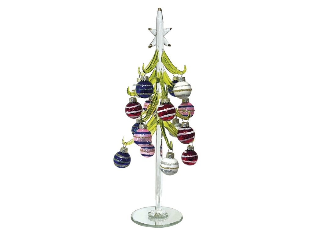Skleněný vánoční stromek zelený s barevnými kuličkami, výška 30 cm