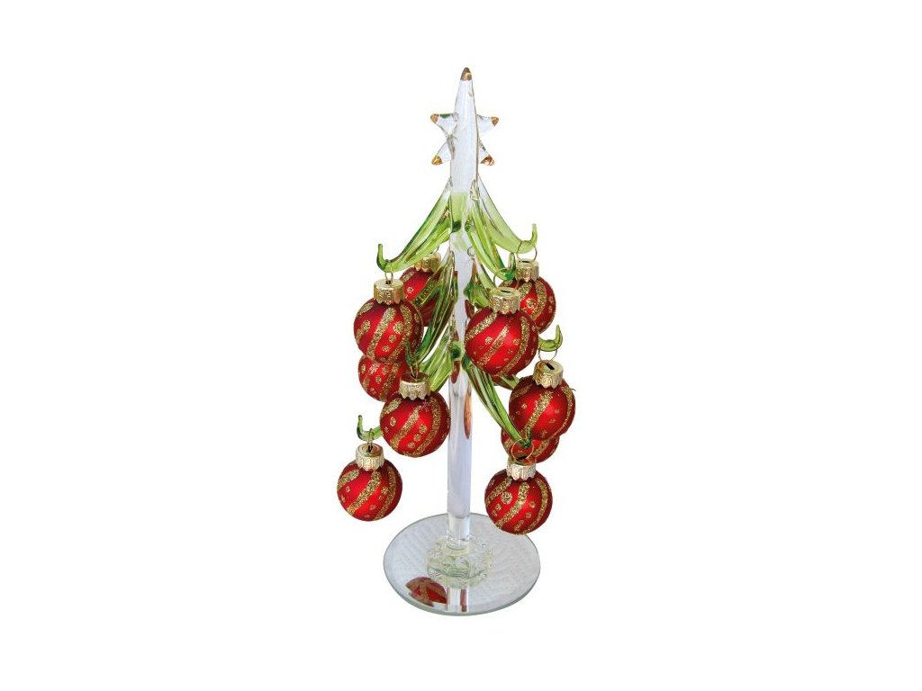 Skleněný vánoční stromek zelený s červenými ozdobami, výška 20cm