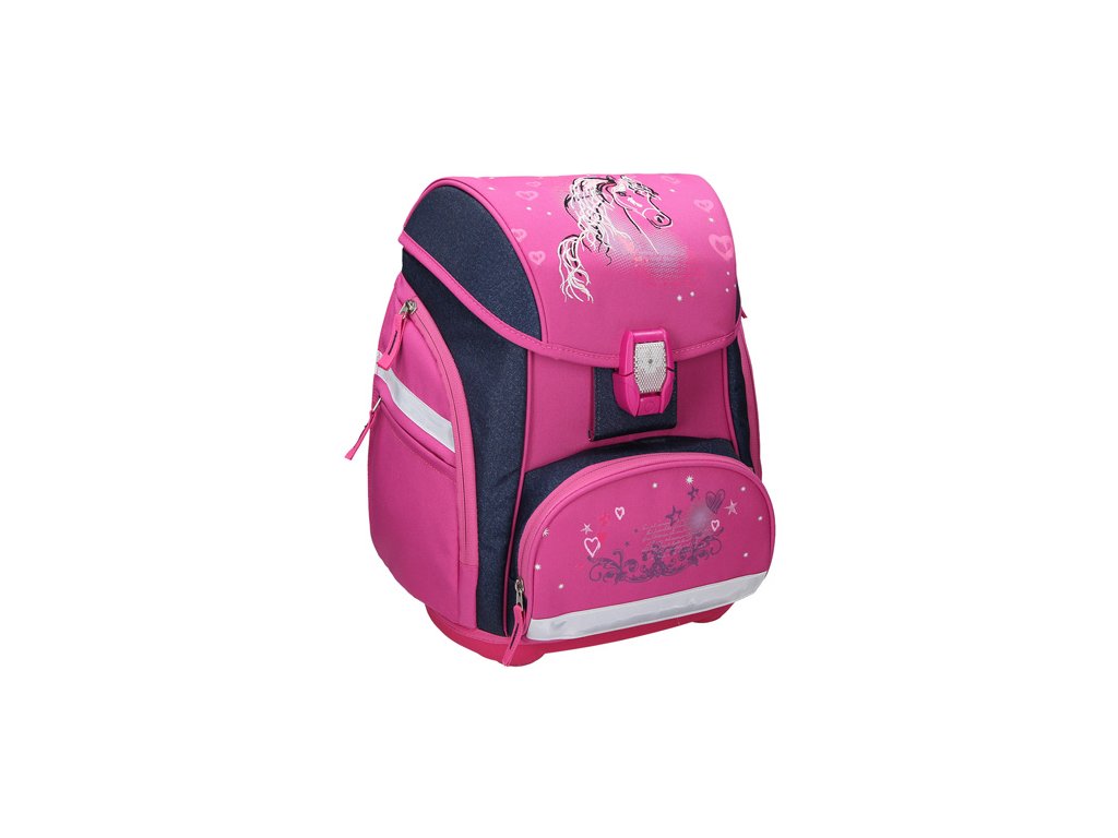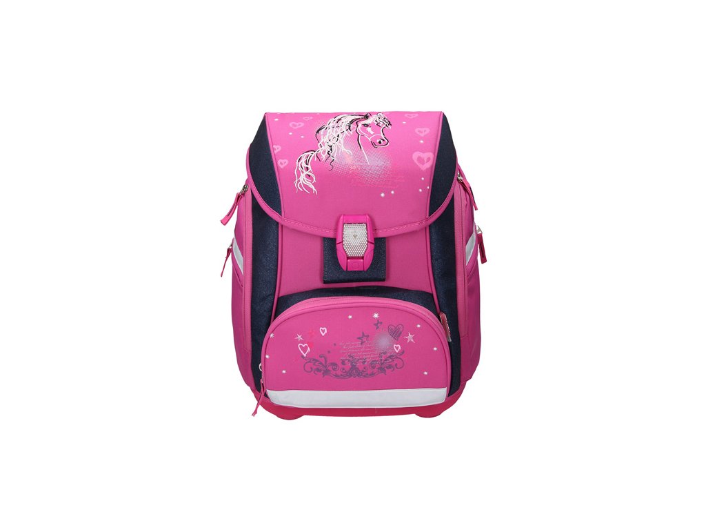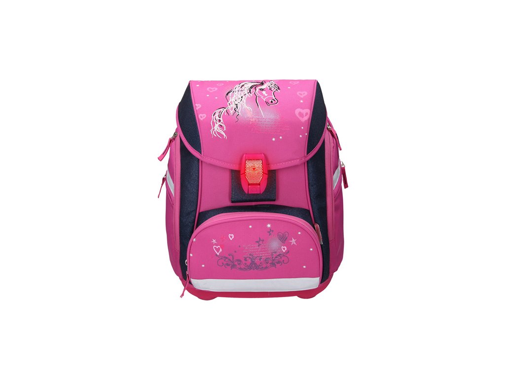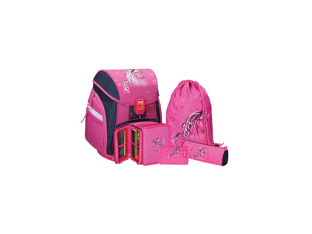 Set obsahuje: školní tašku, pytlík na přezůvky, 17-dílný penál, pouzdro na pera a peněženku. Design Horse 19. - design s vysoce kvalitními 3D aplikacemi a výšivkami - LED přezka s dalšími reflexními prvky pro větší bezpečnost v noci - dvě velké boční kapsy na zip - termo izolované přední kapsa vhodná na svačinu - anatomický systém proudění vzduchu pro optimální větrání - nastavitelný přední pásek (odnímatelný) - elastická, Samostavitelný přední přezkaDoplňkové parametry