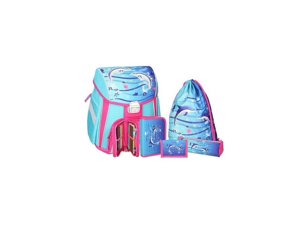 Školní aktovka - 5-dílný set, START Dolphins. Set obsahuje: školní tašku, pytlík na přezůvky, 19-dílný penál, pouzdro na pera a peněženku. • moderní design s 3D potiskem, polyesterový materiál • kvalitní kovová spona s reflexními prvky • reflexní pásy, které zvyšují viditelnost a bezpečnost v noci • anatomicky tvarovaná záda pro snadnou cirkulaci vzduchu • dvě boční kapsy, přední kapsa s tepelnou izolací • přední a zadní nastavitelný pás s plastovou sponou, plně lemované a pohodlné popruDoplňkové parametry