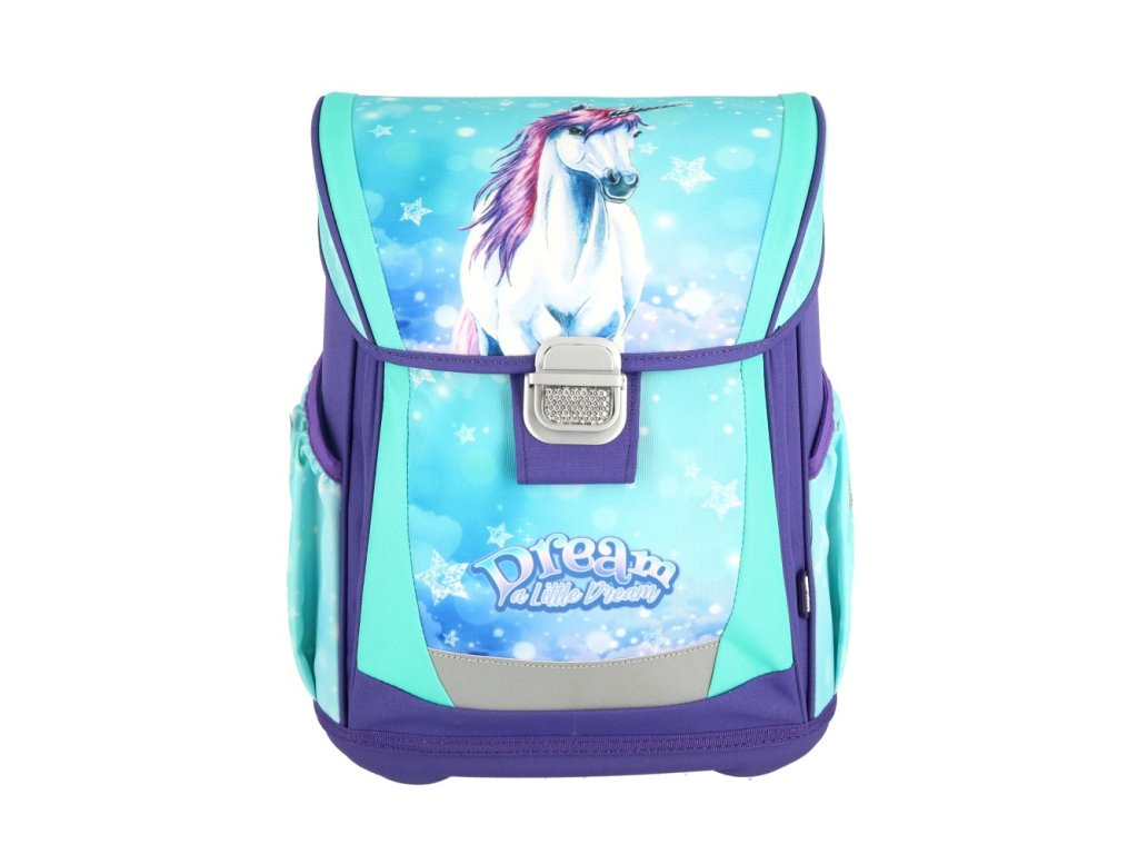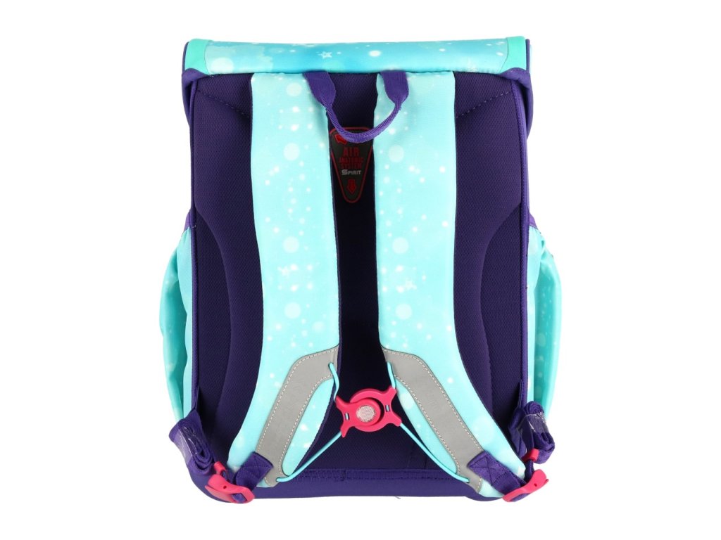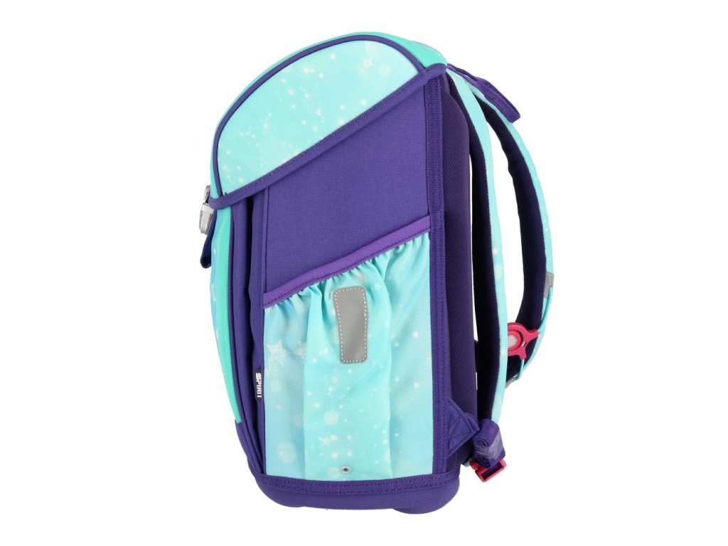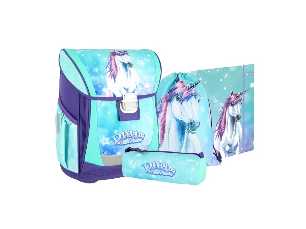 Sada obsahuje: školskú tašku, vrecko na prezúvky, dosky na zošity A4, okrúhle puzdro na písacie potreby (prázdne).