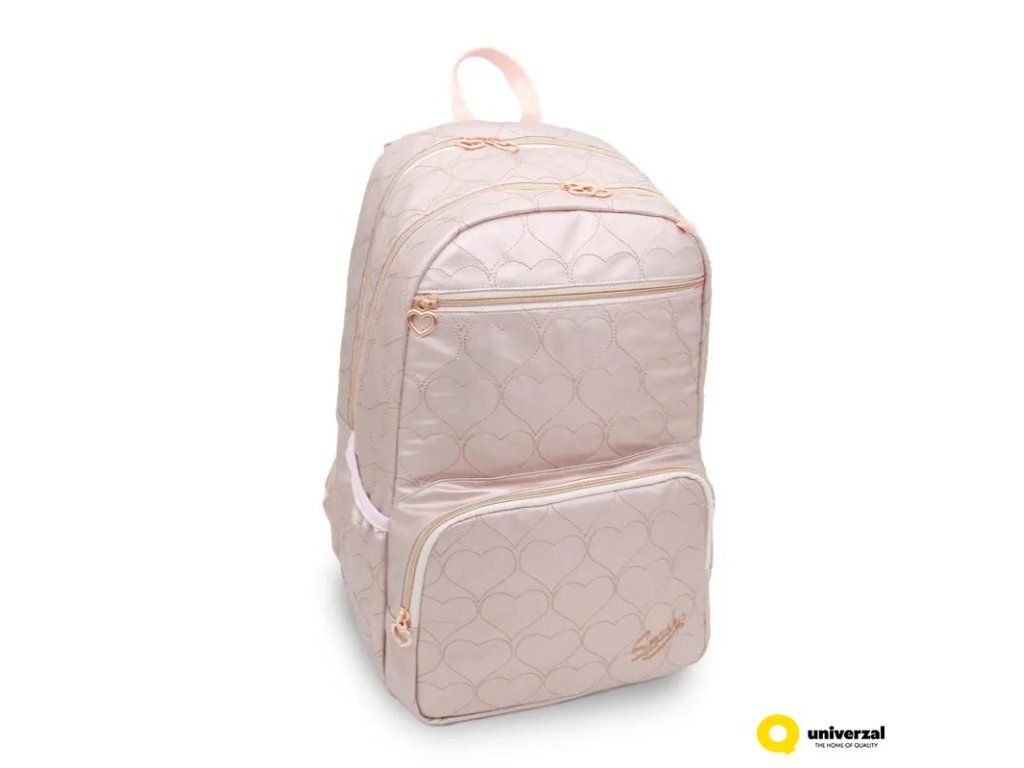 Vysoce kvalitní růžový batoh. Batoh má na přední straně našité logo. Vlastnosti:- anatomická záda s vycpávkami pro pohodlné nošení- ramenní popruhy s popruhy pro regulaci výšky batohu- jedna otevřená boční kapsa- jedna boční kapsa na zip se srdcem barvy růžového zlata- dvě velké dvojité přihrádky na zip se srdíčky - jedna přední kapsa na zip - jedna menší přední přihrádka na zip se srdíčkem- rukojeť pro přenášení- zesílené dno- rozměry 48 x 40 x 18 cmDoplňkové parametry