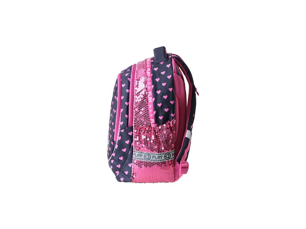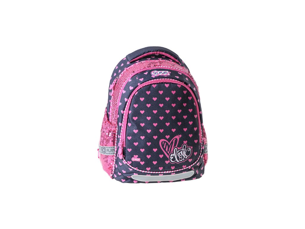Školní batoh Maxx Play, Love: • moderní design, polyesterový materiál / 600D • anatomicky tvarovaná záda pro snadnou cirkulaci vzduchu • dva přední nastavitelné popruhy • dvě horní rukojeti, plně lemované a pohodlné popruhy • reflexní pásy, které zvyšují viditelnost a bezpečnost v noci • vnitřní příčka s jednou velkou kapsou a elastickou gumou • dvě boční elastické kapsy • silné a stabilní dno • rozměry: 41x31x21 cm. Hmotnost: 920 g. Objem: 26 L.Doplňkové parametry