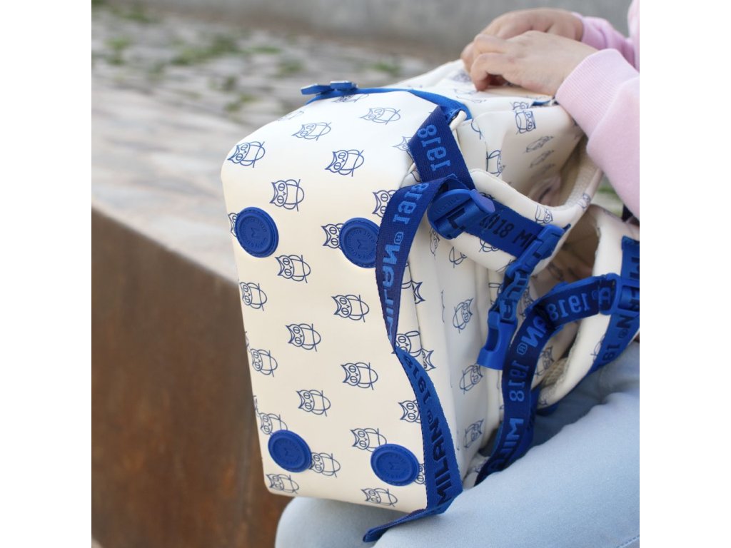 Nastaviteľné ramenné popruhy, predné nastaviteľné popruhy a rukoväť na prenášanie v žiarivej modrej farbe.