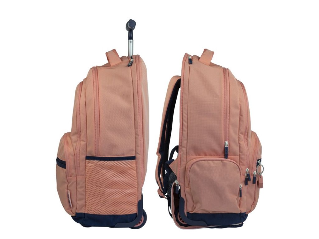 Školní batoh na kolečkách s kovovou výsuvnou rukojetí 1m. Batoh má celkem 6 komor - 6 zipů. Jedna hlavní přihrádka s přihrádkou na notebook. 3 přední kapsy, jedna z nich s organizérem a odnímatelnou klíčenkou. Jedna snadno přístupná boční kapsa ze síťoviny a jedna boční kapsa na zip. Přední kapsa má na zipu kroužek na klíče a gumu. Nastavitelné popruhy, zpevněná základna a kryt kol. Ramenní popruhy a rukojeť lze zcela skrýt.Doplňkové parametry