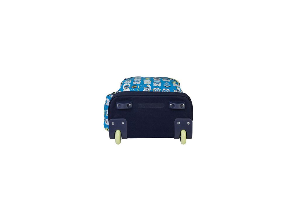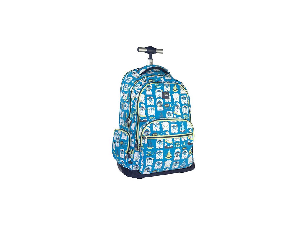 Školský batoh na kolieskach s kovovou výsuvnou rukoväťou. Špeciálna séria Yeti, modrá farba. 6 zipsov. Jedna hlavná priehradka s priehradkou na notebook. 3 predné vrecká, jedno z nich s organizérom a odnímateľnou kľúčenkou. Jedno ľahko prístupné bočné sieťované vrecko a jedno bočné vrecko na zips. Nastaviteľné popruhy, spevnená základňa a kryt kolies. Ramenné popruhy a rukoväť je možné úplne skryť. Zloženie látky: polyesterová vonkajšia tkanina a vnútorná podšívka. Veľkosť: 52 x 34,5 x 23 cm. Predĺžená rukoväť: 1 m. Kapacita: 25 litrov.Doplňkové parametry