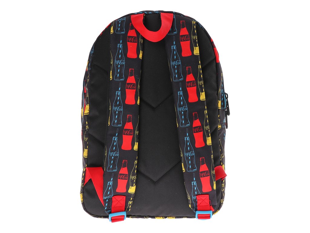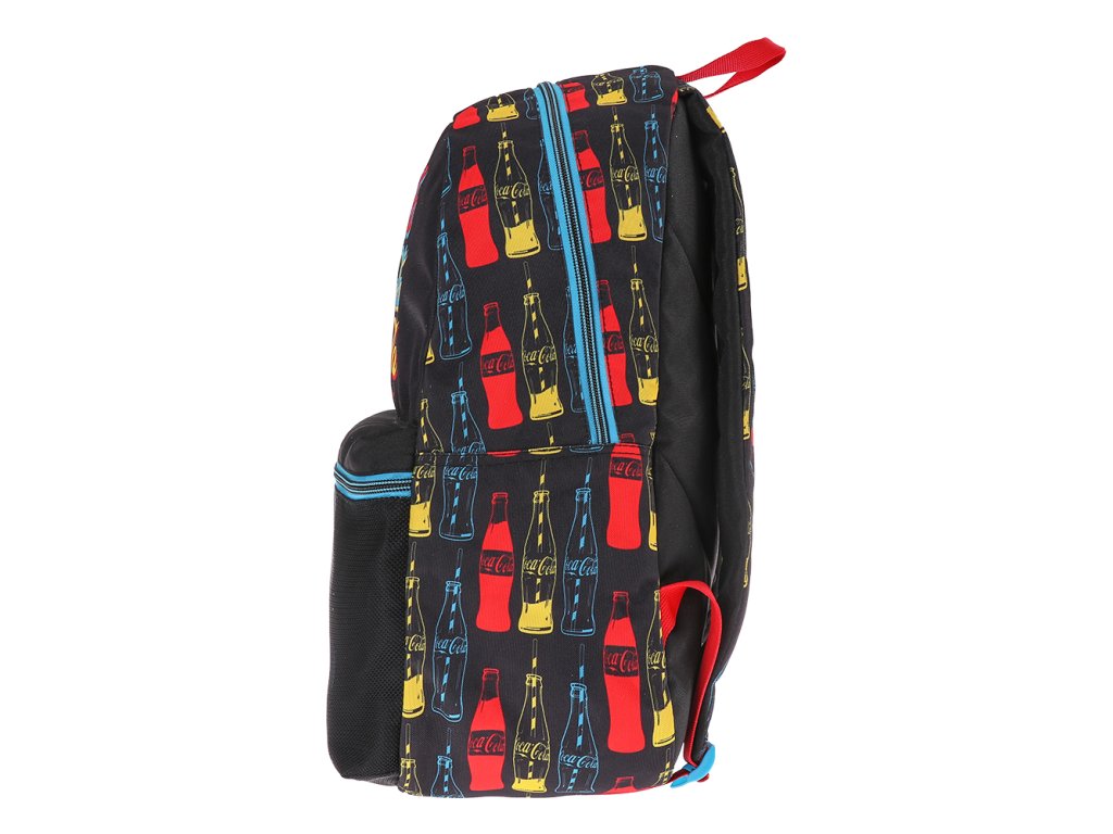 Batoh do školy nebo na volnočasové aktivity Coca Coola (2 zipy). Obsahuje: - hlavní, velká komora bez přepážek - přední větší kapsa na svačinu, telefon, klíče ... - dvě boční síťované kapsy na láhev a pod. Vlastnosti: • Stabilita při postavení • Voděodolná tkanina - vysoce kvalitní polyester, trojité prošití • Nastavitelné popruhy • Lehký a odolný • kvalitní zipy ZOOM s kovovým taháčkem Hmotnost: 350 g Objem: 30 L Materiál: polyester 600DDoplňkové parametry