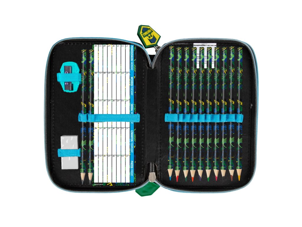 Dvoupatrové pouzdro s motivem fotbal se zapínáním na zip obsahuje kompletní vybavení: 10 ks pastelky, 10 ks fixy, 2 HB tužky s gumou, ořezávátko, pravítko 15 cm, gumu, notes 7,5 x 10,5 cm a rozvrh hodin. Penál má dekorativní potisk nejen na vnější straně, ale i na vybraných prvcích výbavy. Zipy jsou zakončené ozdobnými jezdci pro pohodlnější otevírání penálu. Rozměry penálu: cca 21 x 12 x 4 cm, hmotnost: 330 g, nevhodný pro děti do 3 let.