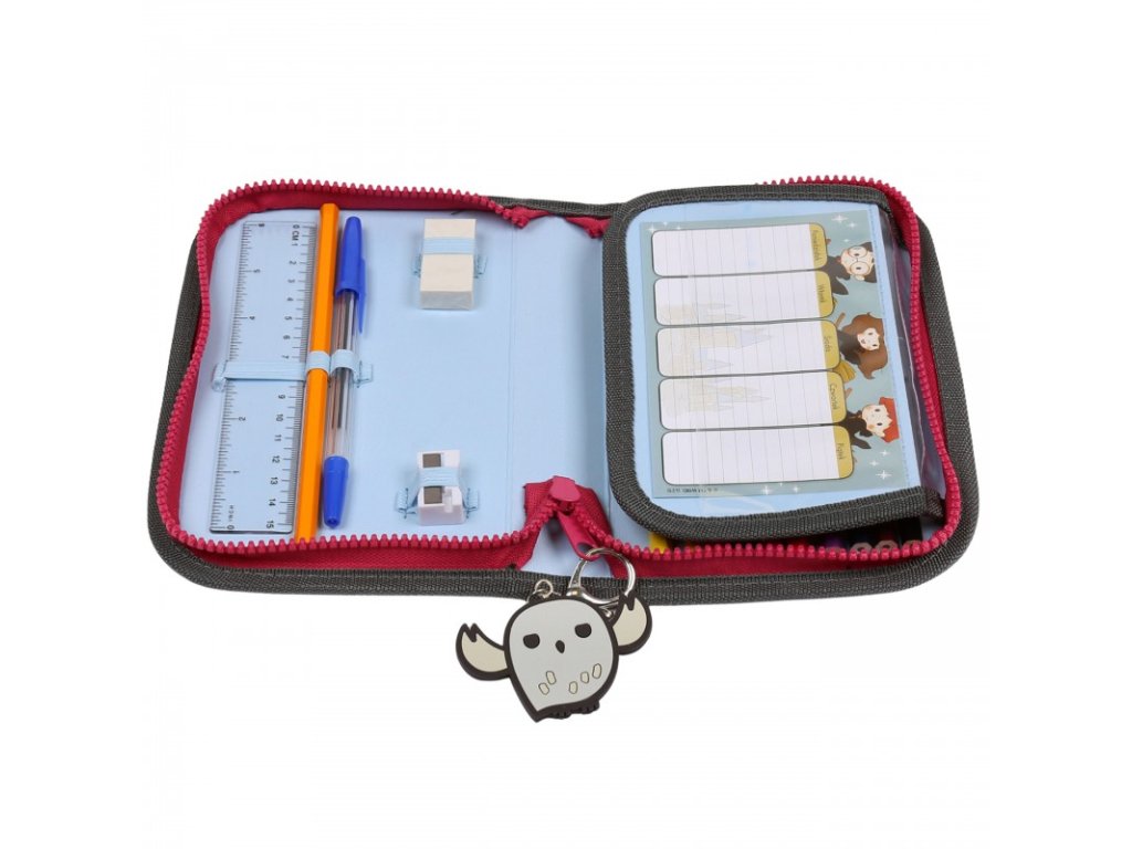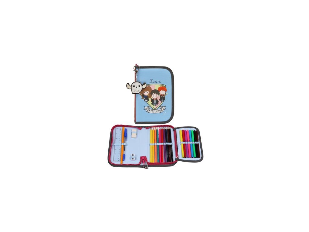 Jednopatrové pouzdro s vybavením v designu Harry Potter s jednou klopou obsahuje: 10 ks pastelky, 7 ks fixy, gumu, pravítko, ořezávátko, 1 ks propiska, ořezávátko a rozvrh hodin. Rozměry: 20 x 13,5 x 3,5 cm. Vhodný pro děti od 3 let.Doplňkové parametry
