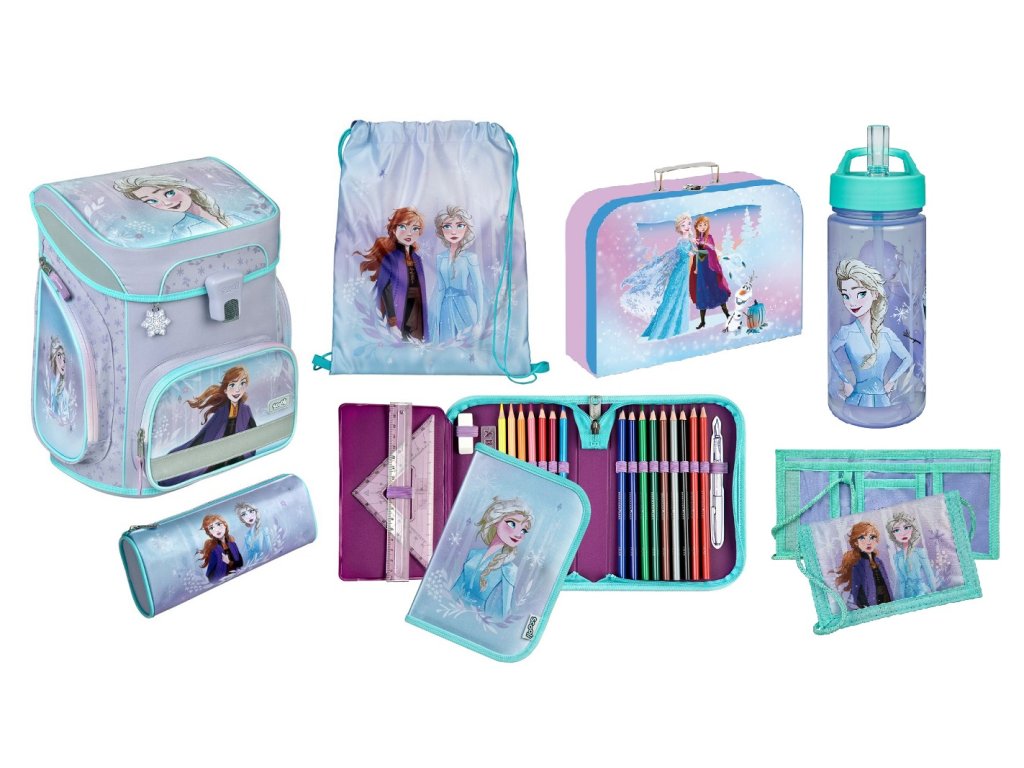 Školní sada Frozen Ledové království set 7 ks batoh, sáček, penál, etue, přívěšek, kufr, láhev, peněženka